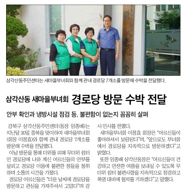 2018년 7월 30일, 삼각산동주민센터(동장 임종배)와 새마을 부녀회에서 관내 경로당 7개소를 방문하고 안부확인과 냉방시설 점검 및 불편한 점은 없는지 꼼꼼히 살폈습니다.
