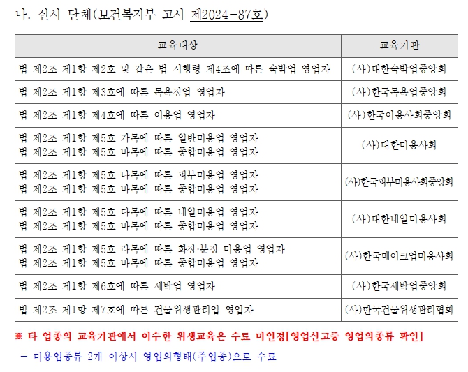 공중위생관리법 제17조(위생교육) 공중위생영업자 매년 위생교육 수료에 따라 업종별 온라인 위생교육 사이트 및 문의처를
