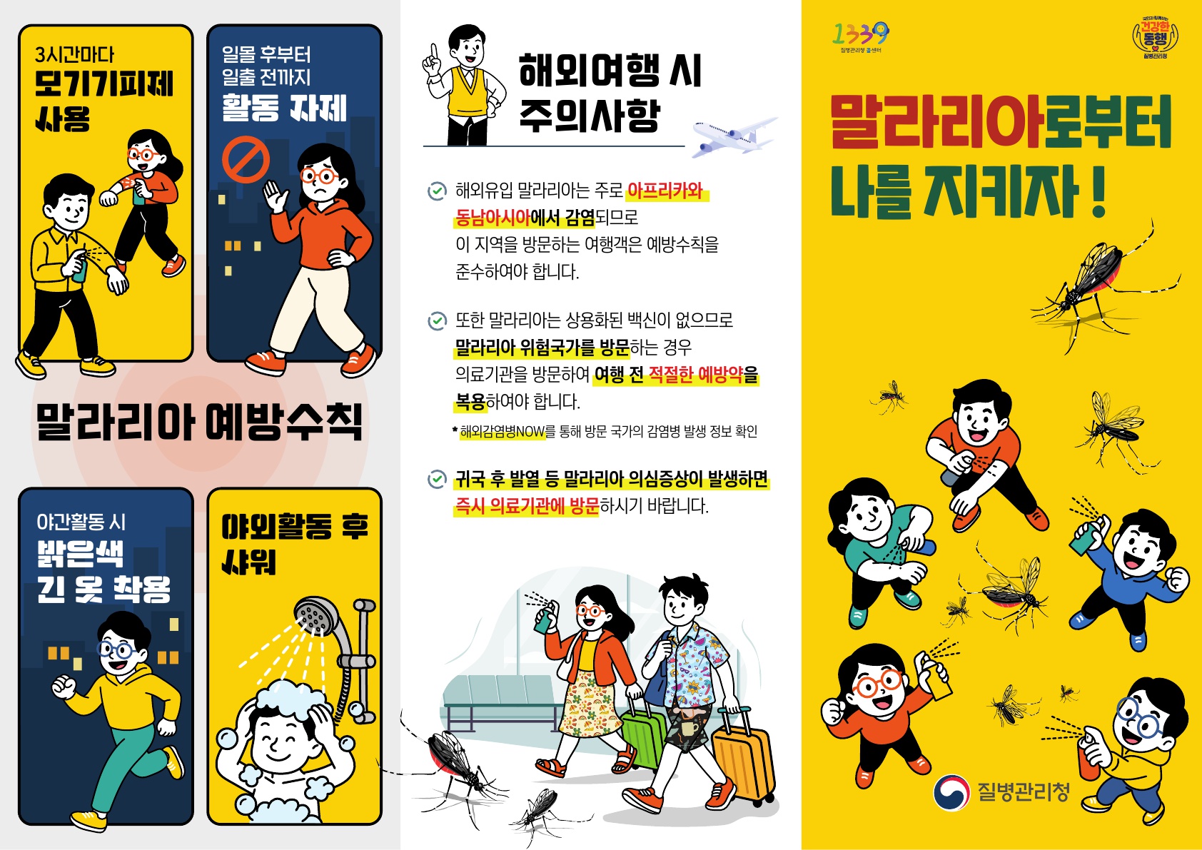 - 말라리아 위험국가를 방문하는 경우 여행 전 적절한 예방약을 복용해야 합니다. (*해외감염병NOW를 통해 감염병 정보 확인)