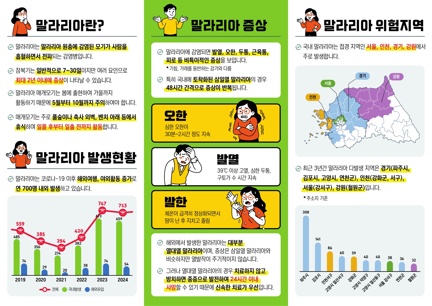 - 최근 3년간 말라리아 다발생 지역은 경기(파주시, 김포시, 고양시, 연천군), 인천(강화군, 서구), 서울(강서구), 강원(철원군)입니다.