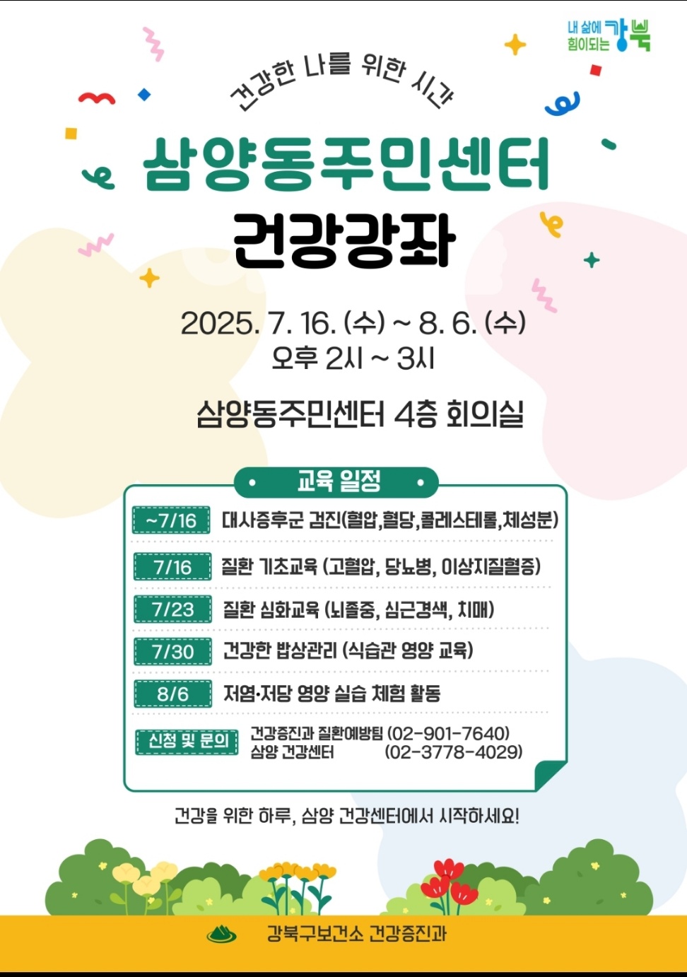 삼양동 주민센터에서 구민들을 위한 건강강좌가 운영되오니 많은 참여 부탁드립니다.