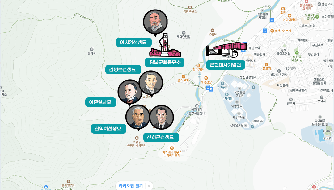 초대검사 이준, 초대 국회의부장 신익희, 초대 대법원장 김병로, 초대 부통령 이시영 선생, 대한민국 최초의 국군 광복군 등 대한민국 근현대사 초대 직위를 역임하신 분들의 묘역 길