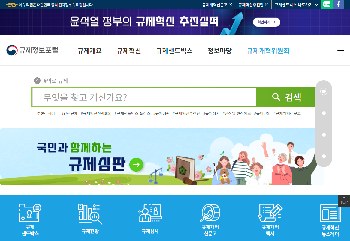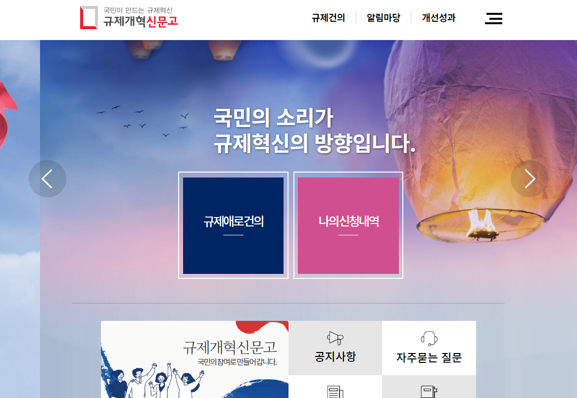 범 정부 규제건의 창구는 국무조정실 규제개혁신문고(www.sinmungo.go.kr)로 통합되어 운영되고 있습니다.