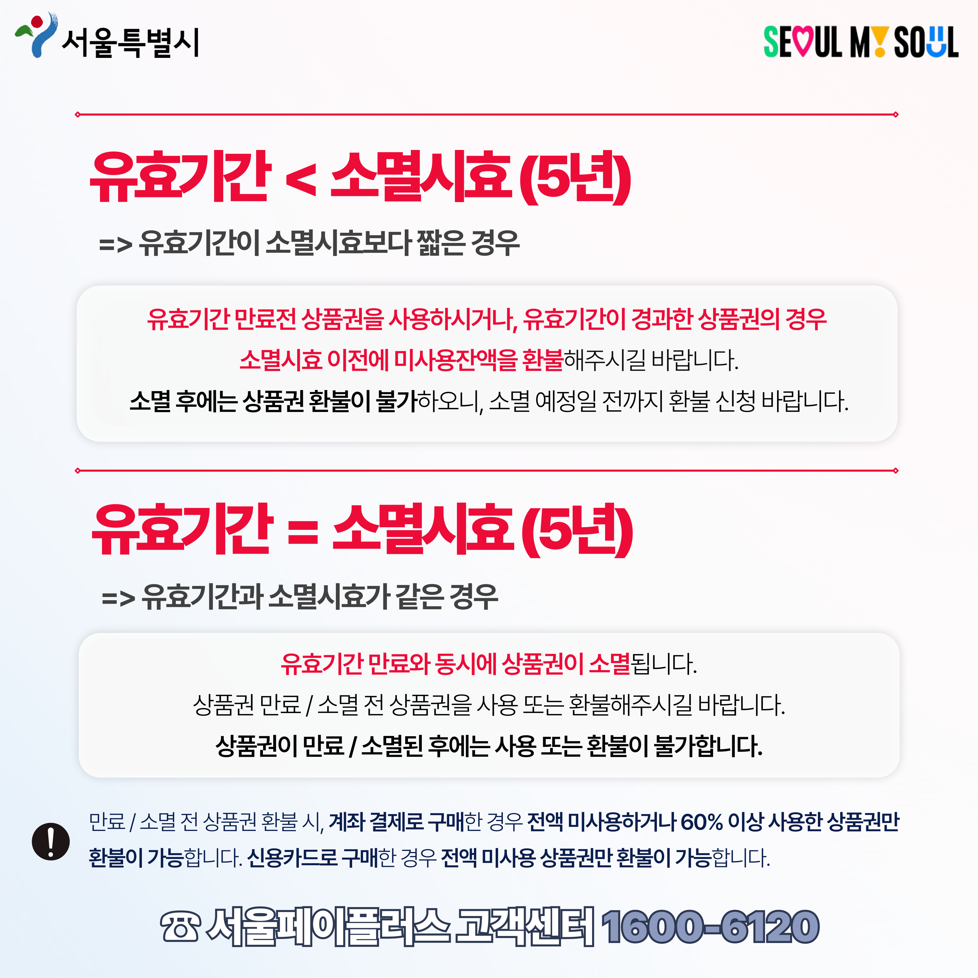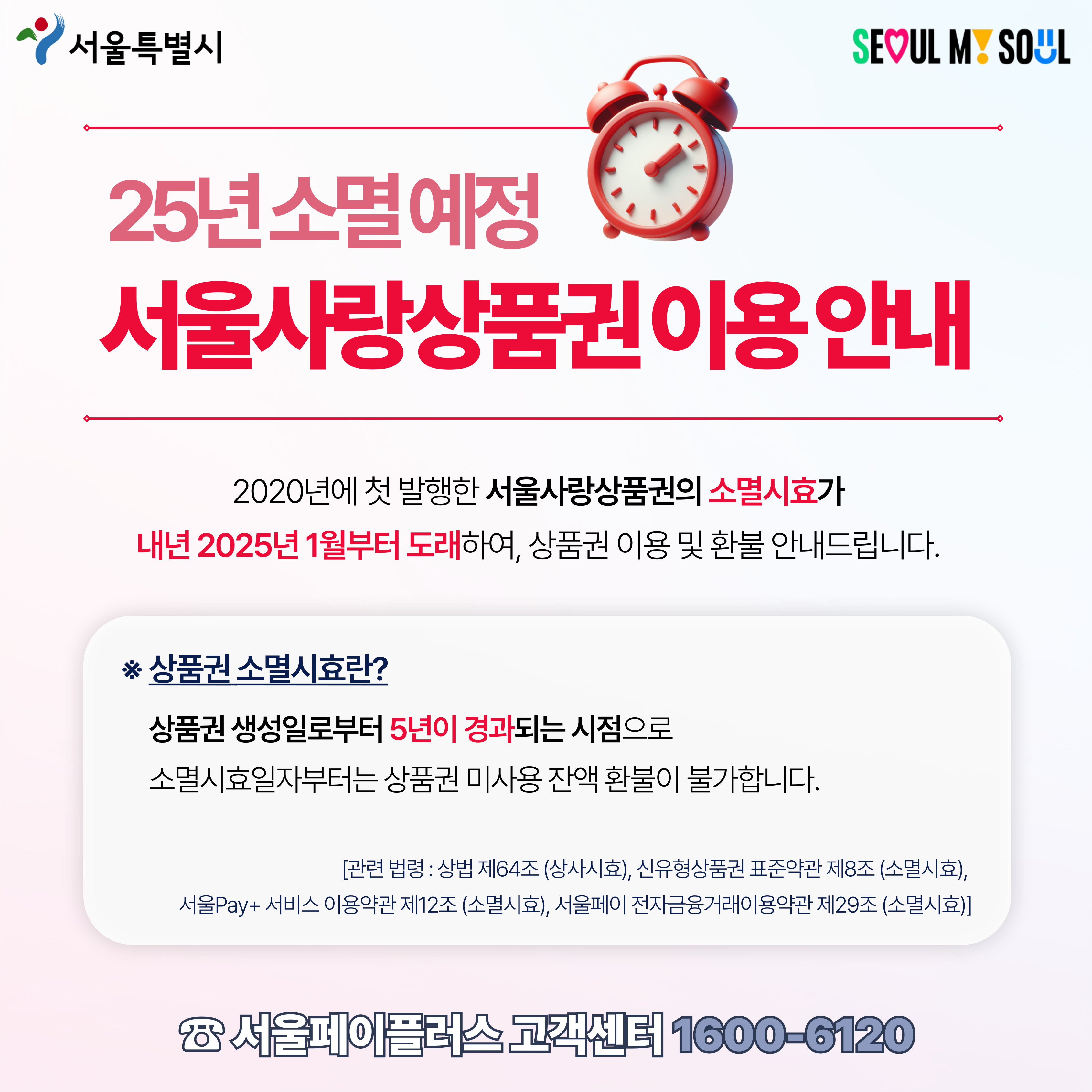 2020년에 첫 발행한 서울사랑상품권의 소멸시효가 내년 2025년 1월부터 도래하여, 상품권 이용 및 환불 안내드립니다.