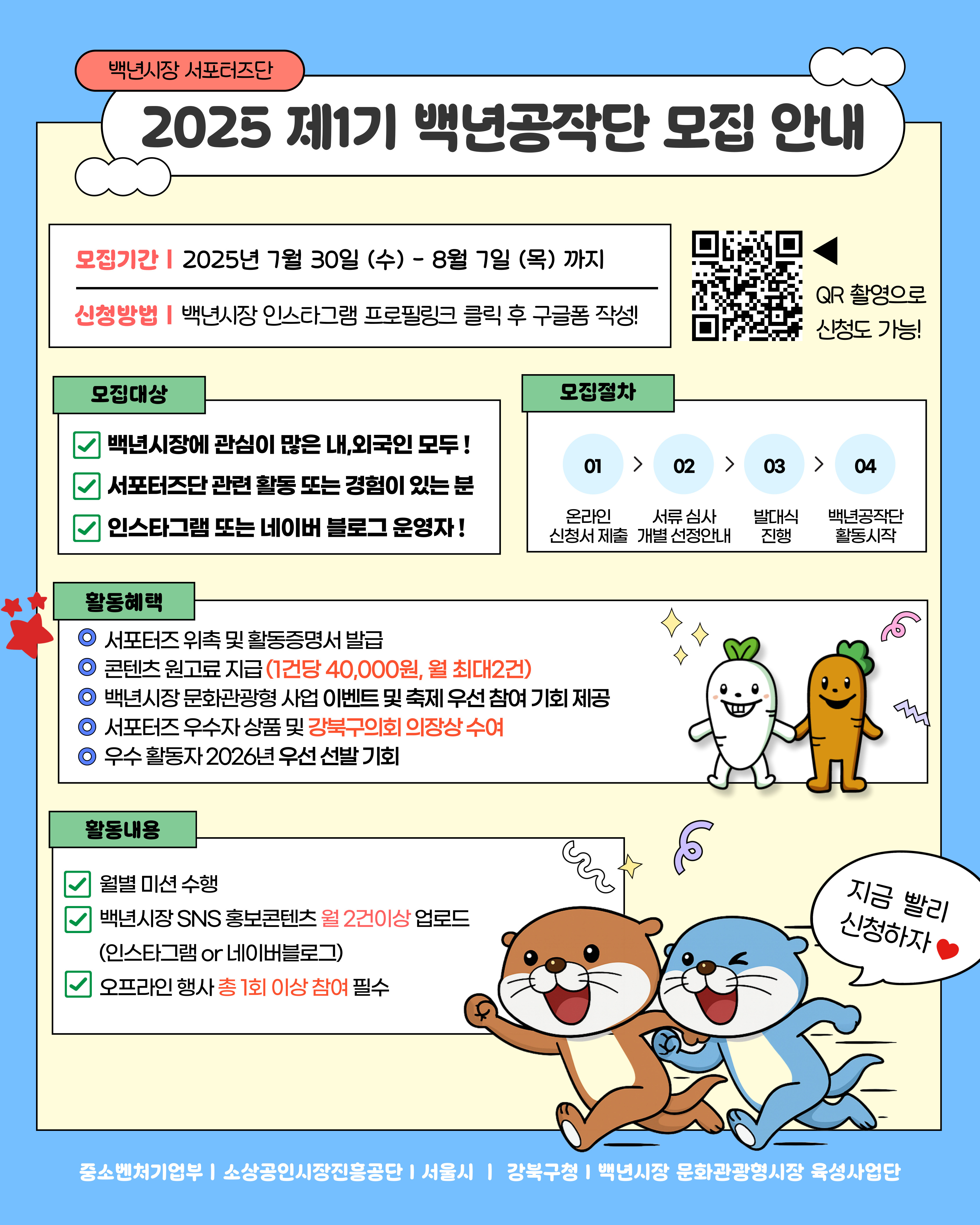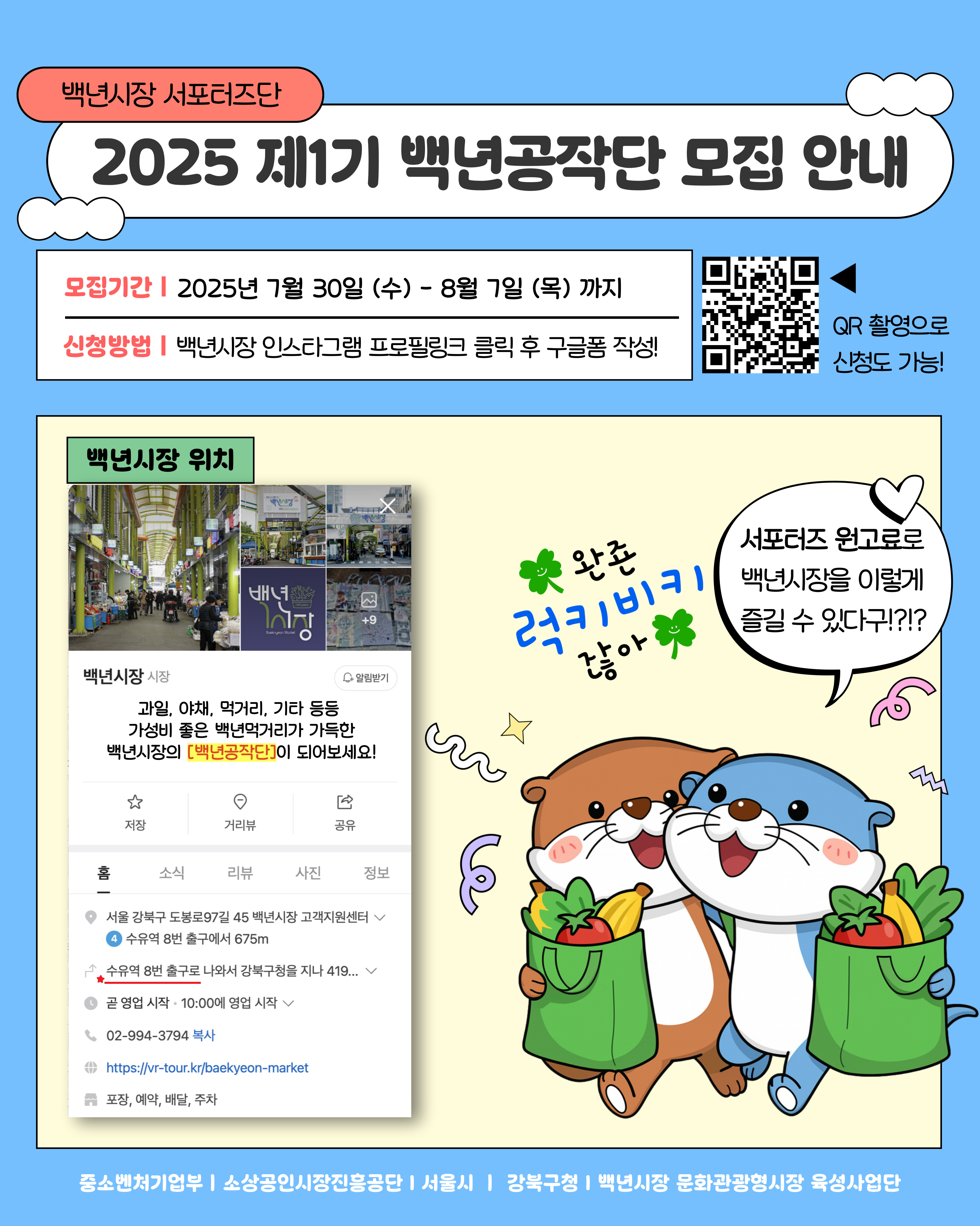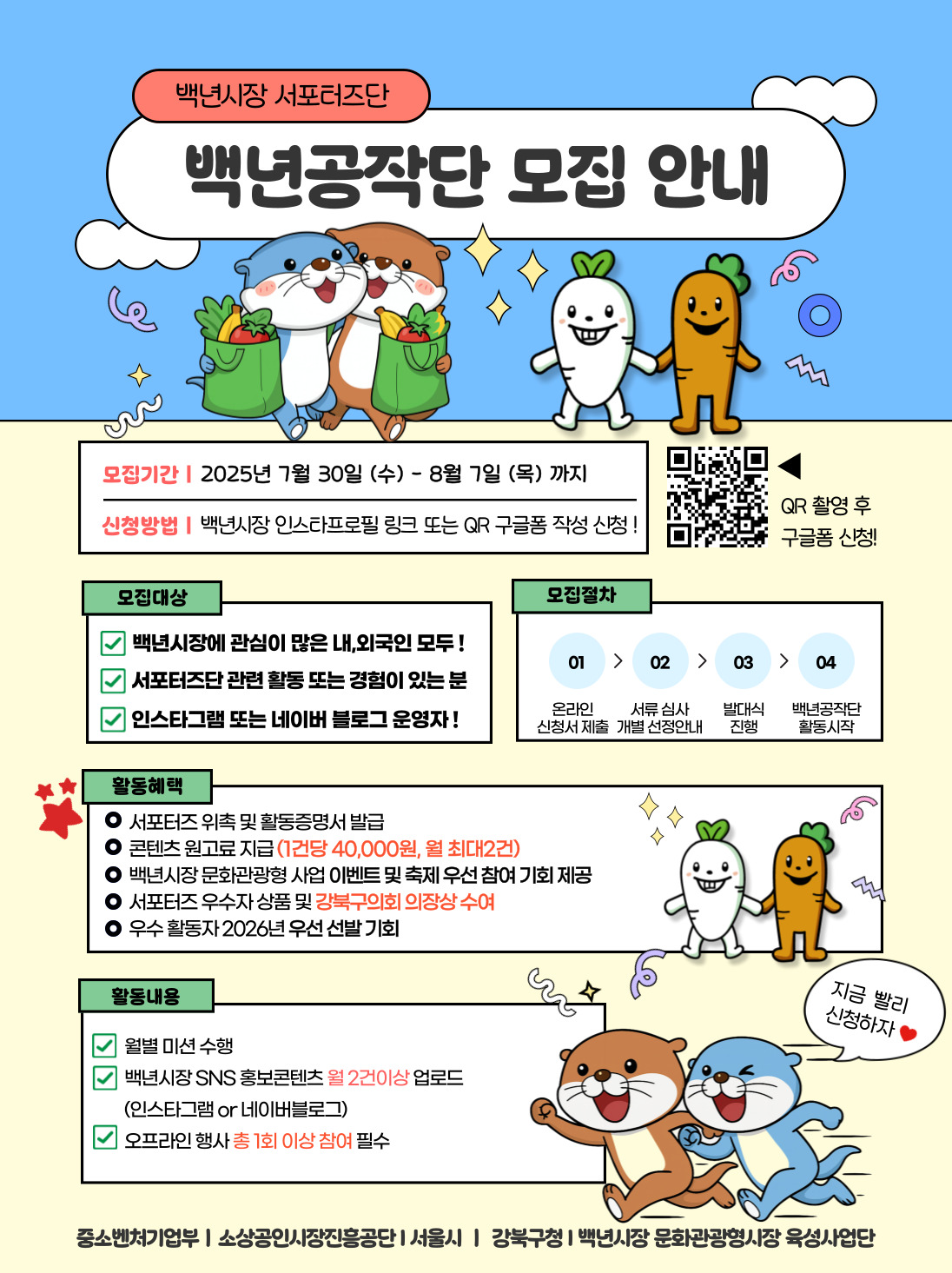 SNS를 통해 홍보하며 온라인 바이럴을 주도할 '제1기 백년시장 서포터즈, 백년공작단'을 하기와 같이 모집하오니 관심있는 분들의 많은 참여 부탁드립니다.