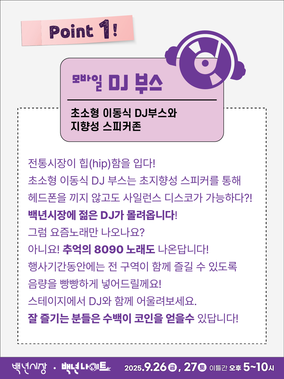 초대형 미러볼과 네온사인, 미니DJ부스가 있어 남녀노소 누구나 즐길 수 있는 레트로 테마의 야시장,