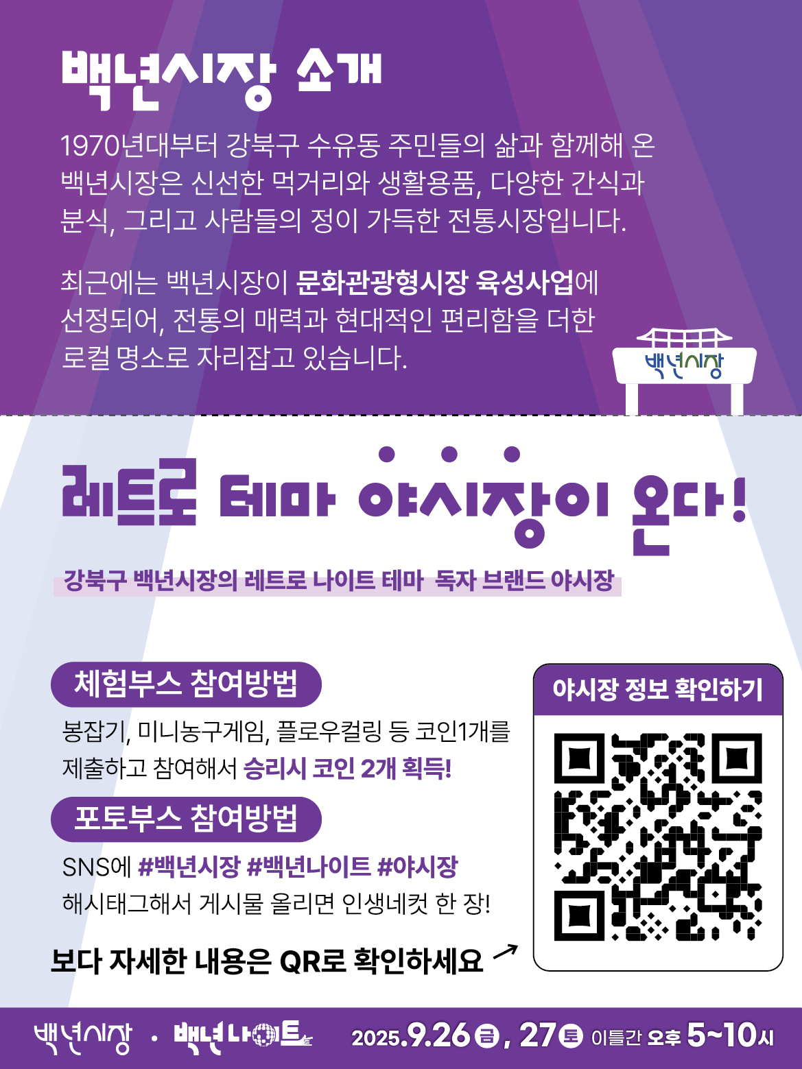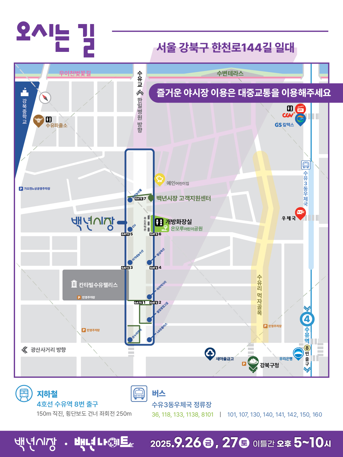 장 소: 서울특별시 강북구 백년시장(서울 강북구 한천로144길 일대)