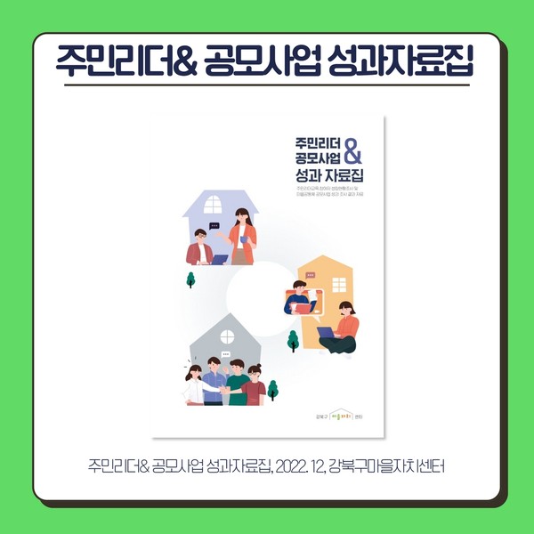 [여는글] 마을공동체 사업이 2013년도에 시작했으니, 벌써 10년이 되어갑니다. 강북구 마을공동체는 2019년 7월까지는 '강북구마을생태계조성지원단'이라는 이름으로, 2019년 8월부터는 '강북구마을자치센터'라는 이름으로 강북구 마을생태계를 만들어 나가는데 필요한 지원을 해왔습니다. 그 중 등장한 주민들이 마을에서 지속적으로 역할을 할 수 있도록 15년부터 이어온 '주민리더과정'은 현재도 가장 중요하게 생각하는 교육프로그램 중 하나입니다. 주민리더과정을 통해 많은 주민들이 등장했고, 모임과 마을안에서 소금과 같은 역할을 하기 위해 오늘도 분주히 애쓰고 계십니다.