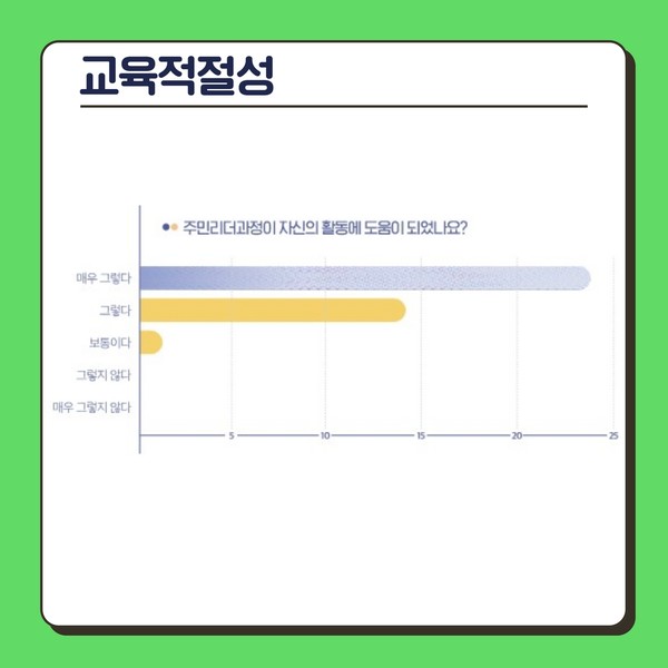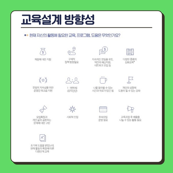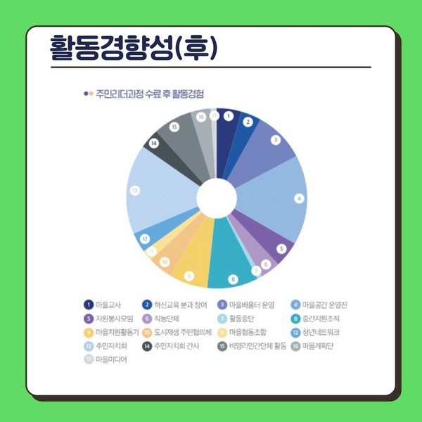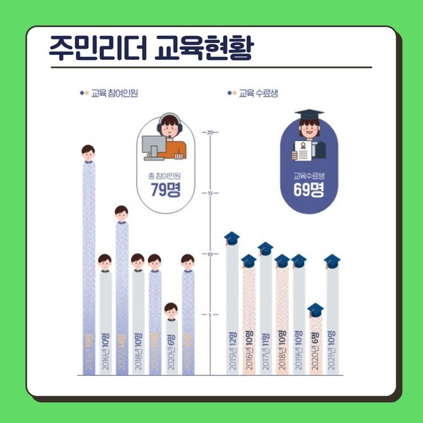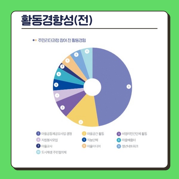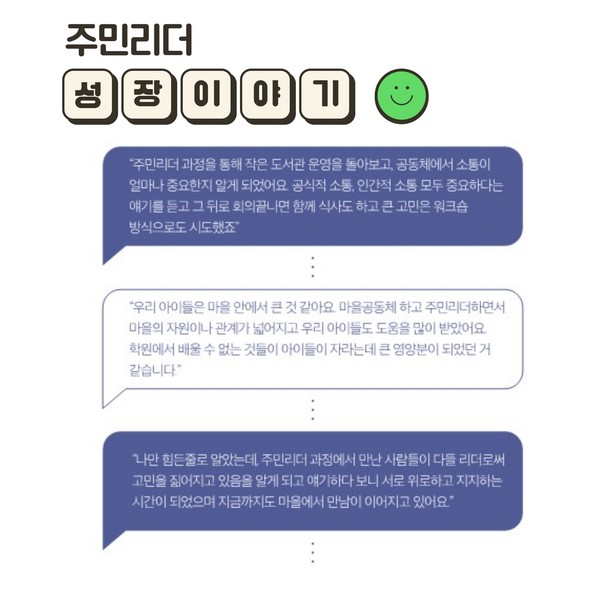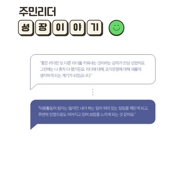 '주민리더교육' 그리고 교육을 계기로 더 다양하게 마을에 접속한 주민리더들의 이야기를 이번 연구리포트 편에 실어 보내드립니다. 그간의 주민리더교육이 실제 어어떤 부분의 리더성장의 요소가 되었는지, 실제 성장할 수 있는 계기가 되었는지 등을 E-Book을 통해 자세히 확인할 수 있습니다. 그 중 주민리더교육에 대한 결과 내용부터 이번에는 요약해서 보여드립니다. 공모사업 결과에 대한 내용은 다음 회차로 리포트 하겠습니다.