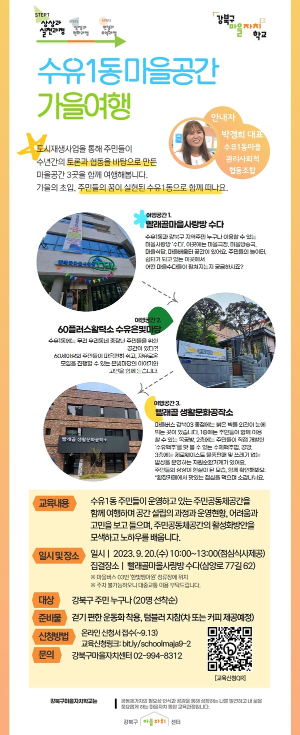 강북구마을자치센터에서는 매월 강북구마을자치학교를 진행한다. 마을공동체와 주민자치회를 통해 등장하고 성장한 주민들이 한 달에 한번 강의를 통해 마을에서의 새로운 상상과 꿈을 꿀 수 있는 자리이다. 9월에는 가을답게 강의실에서 나와 마을공간이 풍성한 수유1동으로 공간탐방여행을 진행했다.