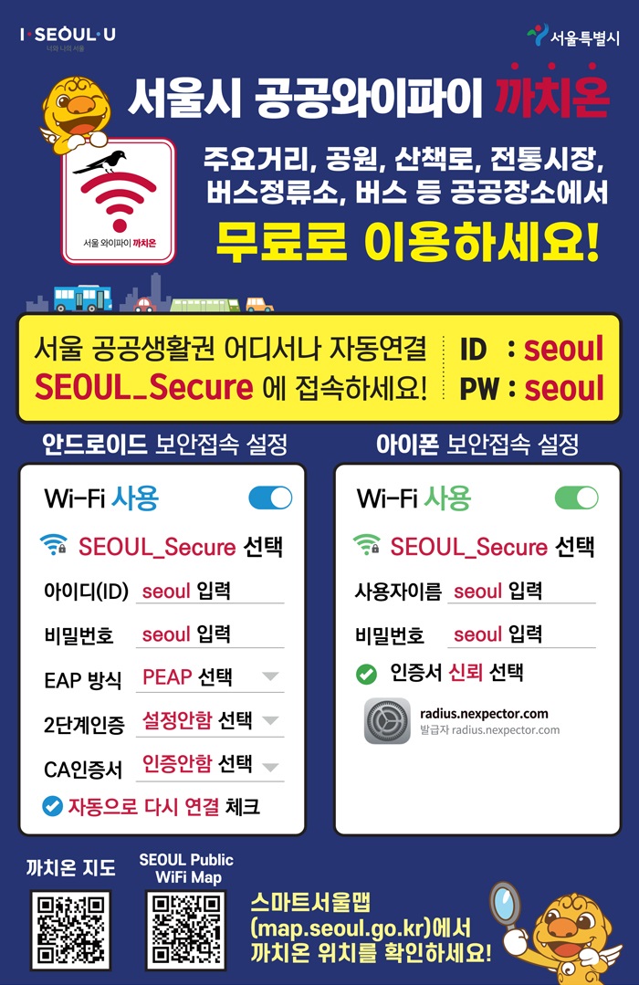 스마트폰 와이파이 기능을 켜고 ‘SEOUL_Secure’ 선택 후 ID seoul, 비밀번호 seoul 저장하면 어디서나 자동 접속