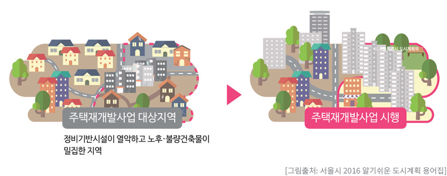 - 주택재개발사업 대상지역 : 정비기반시설이 열악하고 노후·불량건축물이 밀집한 지역