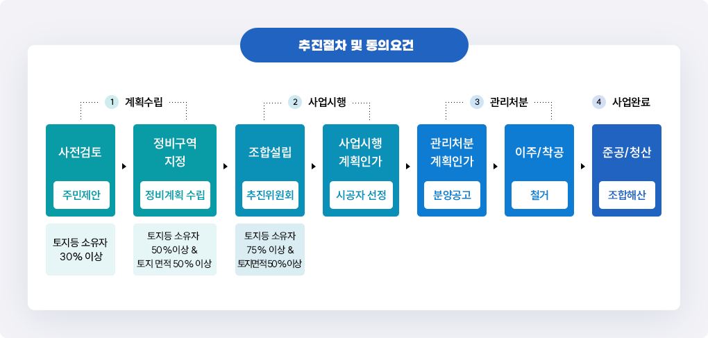 - 조합설립(추진위원회)토지등 소유자 75% 이상 & 토지면적 50% 이상
