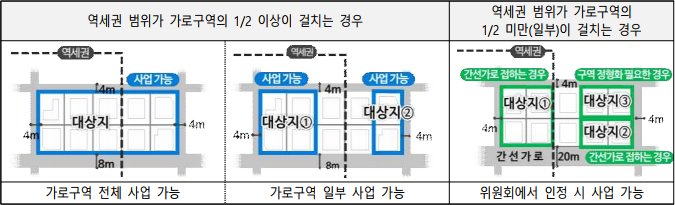 사업대상자는 역세권등 내를 원칙으로 한다. 승강장 경계로부터 1)에서 정한 거리 이내 지역이 가로구역의 ½ 이상이 걸치는 경우에는 가로구역 전체를 사업대상지로 보며, 가로구역의 ½ 미만(일부)이 걸치는 경우에는 간선가로(폭 20m 이상 도로)에 접한 경우나 구역 정형화 등의 필요성이 인정되는 경우에 한하여 위원회에서 인정 시 사업 대상지로 볼 수 있다.