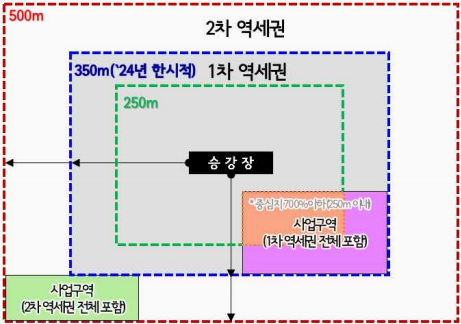 - 1차 역세권은 역 승강장 경계로부터 250m 이내의 범위로 한다. 단, 주택공급 활성화를 위해 ‘24년 12월 31일까지 한시적으로 1차 역세권은 역 승강장 경계로부터 350m 이내의 범위로 한다.