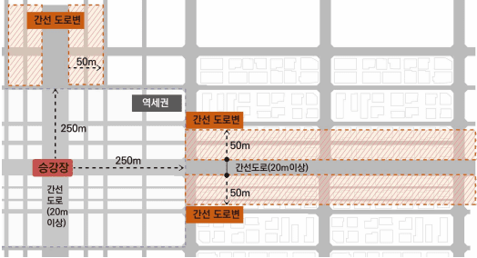 - 도로법 제14조(특별시도의 지정⸱고시)에 따라 고시⸱운영 중인 특별시도 중 1-3-1. 가목의 역세권 외부에 위치한 폭 20m 이상의 주간선도로, 보조간선도로의 경계로부터 직각으로 50m이내의 지역을 말한다.(도시고속도로는 제외한다.)
