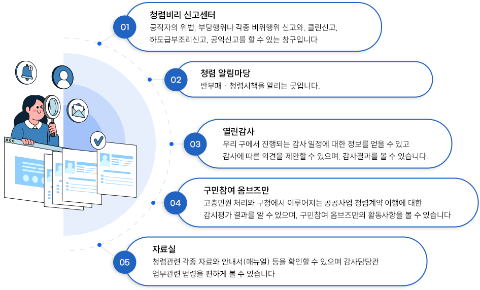 고충민원 처리와 구청에서 이루어지는 공공사업 청렴계약 이행에 대한 감시평가 결과를 알 수 있으며, 구민참여 옴브즈만의 활동사항을 볼 수 있습니다