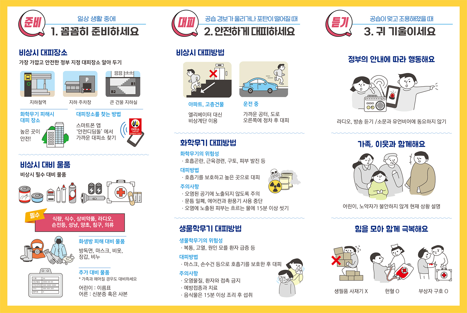 꼭 기억하세요! 비상시 국민행동요령은 준비! 대피! 듣기!