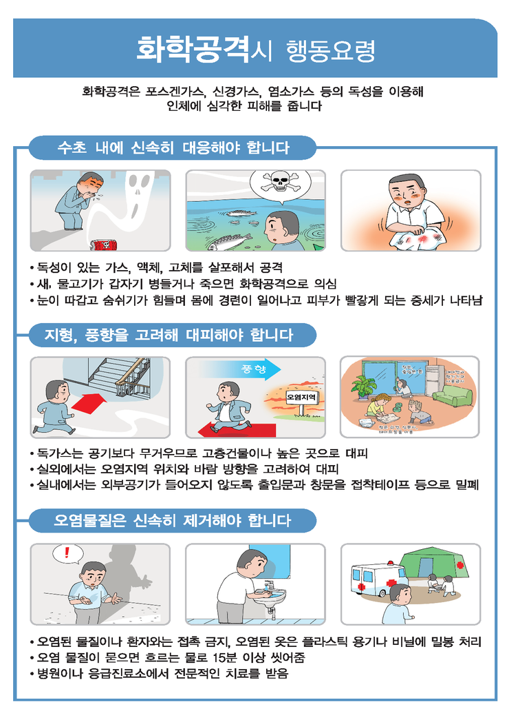 - 독가스는 공기보다 무거우므로 고층건물이나 높은 곳으로 대피