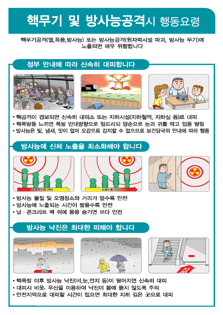 - 핵폭발 이후 방사능 낙진(비,눈, 먼지 등)이 떨어지면 신속히 대피