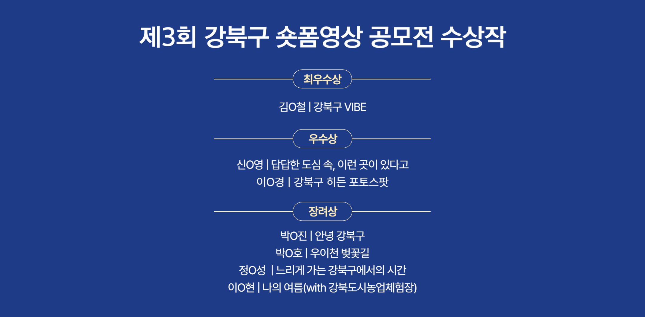 - 당선작 발표: 2025. 07. 30.(수) 강북구 홈페이지 게시 예정