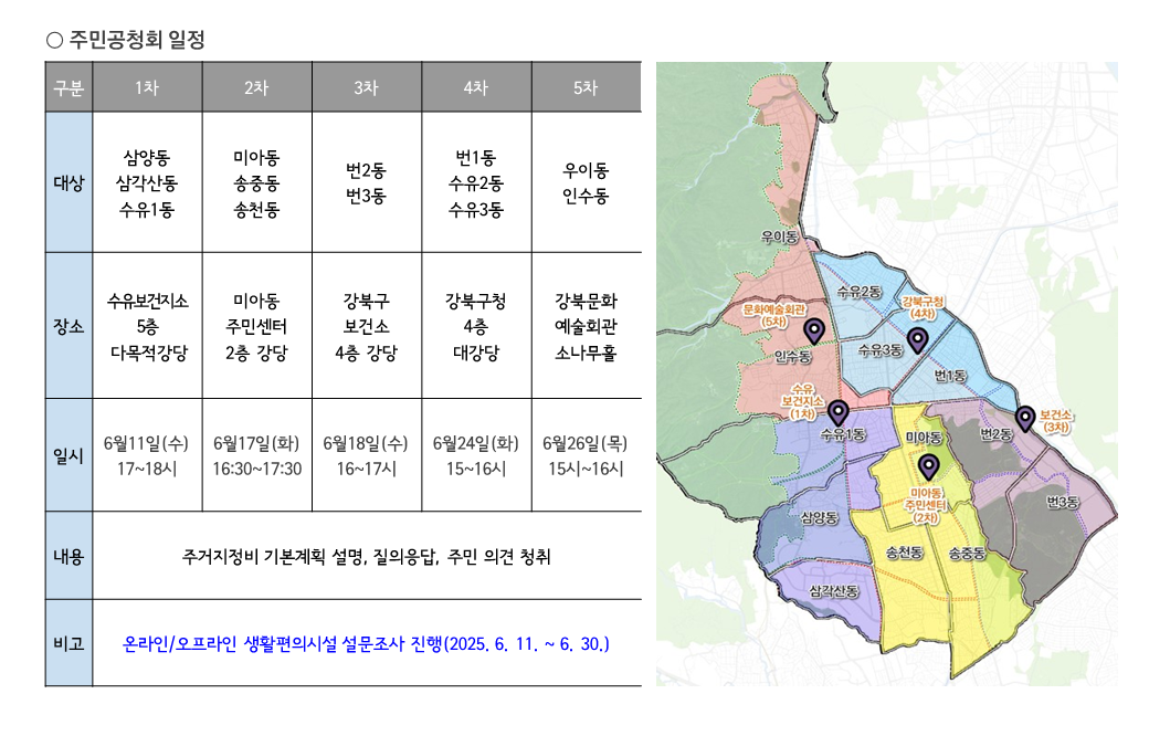 2025년 6월 이후 주민공청회를 지역별 총 5회를 개최하여 각 지역주민에게 강북구 주거지정비 기본계획의 내용을 설명하고 주민의견을 수립하여 주민과 함께 만드는 강북구 주거지 미래의 발전방향을 담는 주거지정비 기본계획을 수립하겠습니다.