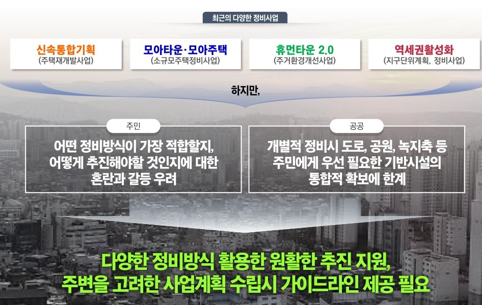 주민은 내가 살고 있는 지역에 어떤 정비사업 방식이 가장 적합할지? 어떻게 추진해야할지? 에 대한 혼란과 갈등을 겪고, 공공에서도 정비사업이 추진되는 지역 외 주민에게 우선 필요한 도로, 공원 등 기반시설의 통합적 확보에 한계를 느끼고 있는 상황입니다.