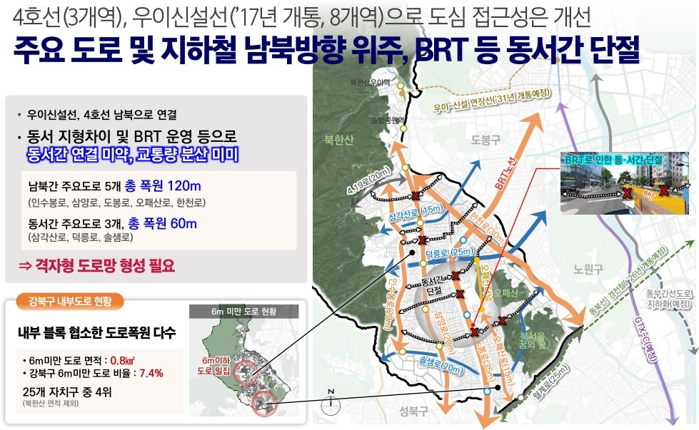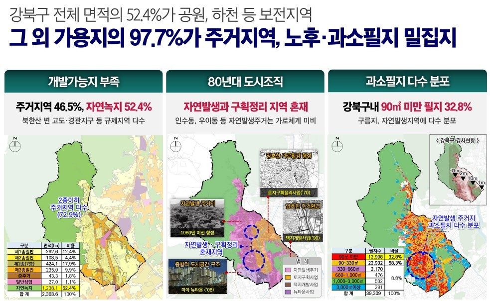 강북구는 전체 면적의 52.4%가 공원, 하천 등 보전지역이고 그 외 가용지의 97.7%가 주거지역으로 개발가능한 토지가 부족하고 인수동, 우이동 지역은 자연발생주거지역으로 가로체계가 다른 지역에 비해 열악한 상황입니다.