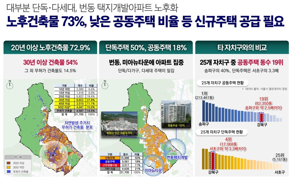 강북구 대부분 지역이 단독주택과 다세대 주택으로 25개 자치구 중 단독주택은 4위, 공동주택 동수는 19위로 타지역에 비해 낮은 공동주택 비율이며, 20년 이상 노후건축물이 약 73%로 신규주택 공급이 필요한 상황입니다.