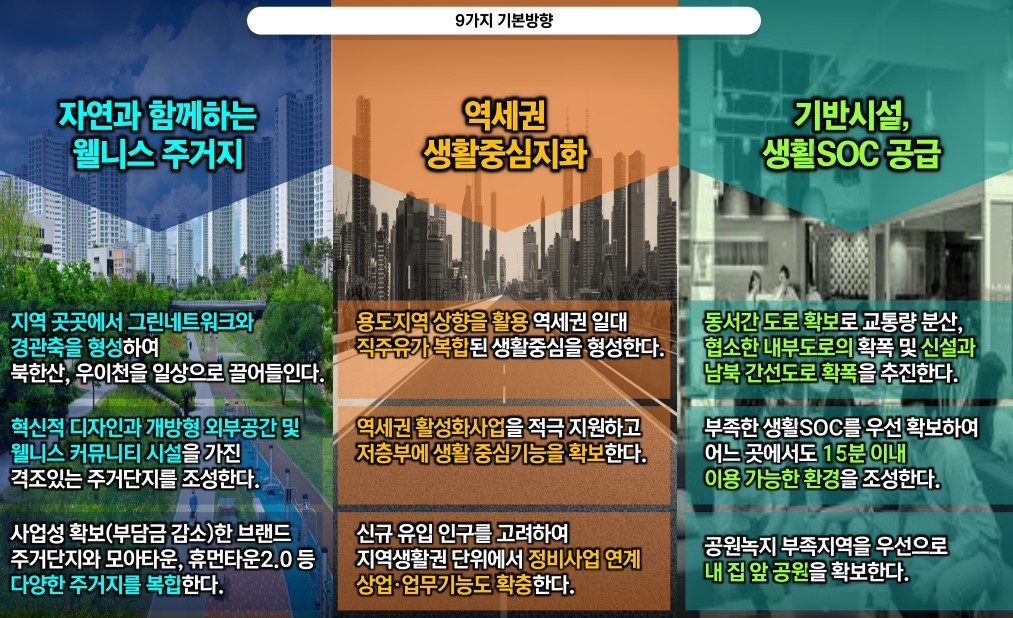3가지 구상(안)을 실현하기 위해 아래와 같이 9가지 기본방향으로 주거지정비 기본계획을 구상할 예정입니다.