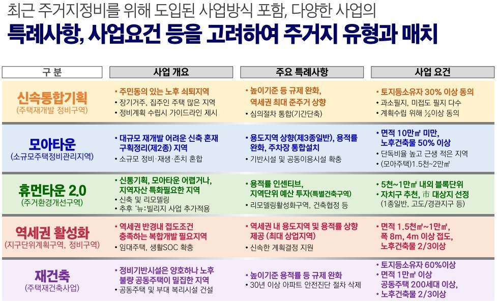 최근 주거지정비를 위해 도입된 사업방식 포함, 다양한 사업의 특례사항, 사업요건 등을 고려하여 주거지 유형과 매치