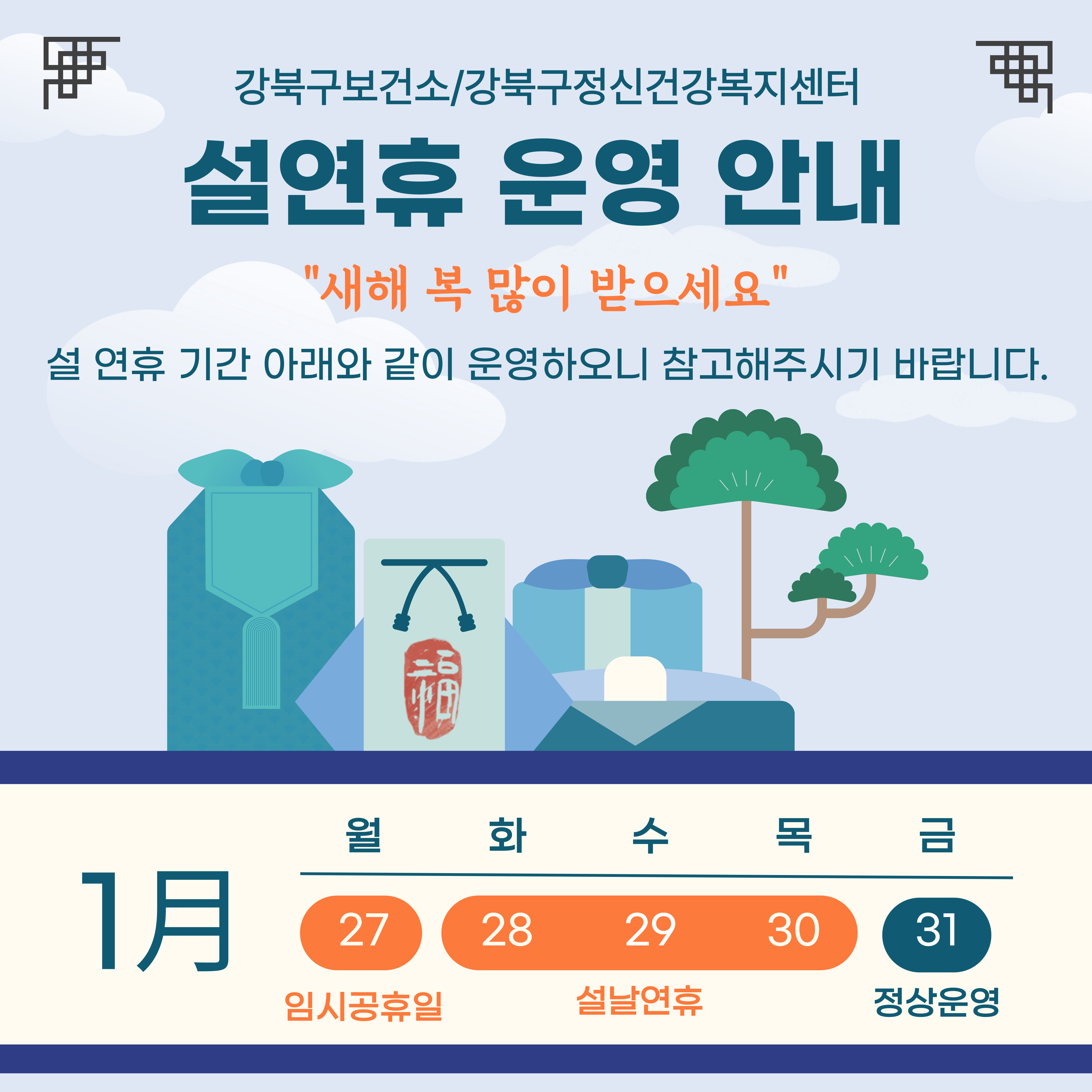 안녕하세요 강북구정신건강복지센터입니다. 설연휴 운영 안내 드립니다. 이용에 참고 해주시기 바랍니다. 건강이 가득하고 행복이 곳곳에 만개하는 2025년이 되길 기원합니다.