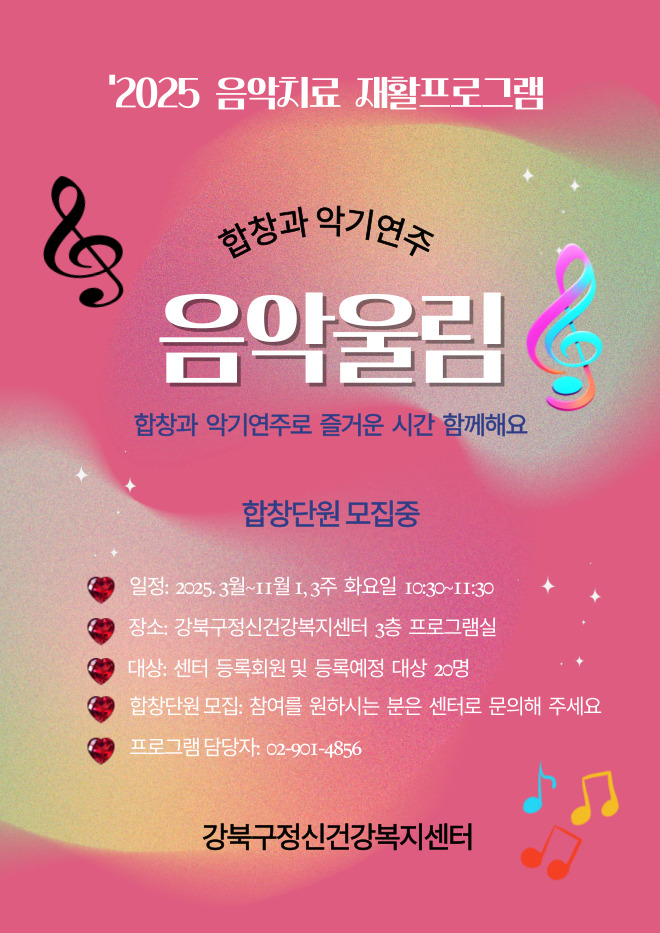 안녕하세요 강북구정신건강복지센터입니다. 올해 3월에 신설되는 재활프로그램들이 몇몇 있는데요, 그 중 하나인 "음악울림" 프로그램 입니다. 음악치유프로그램으로, 합창과 악기연주를 함께하며 협동심도 기르고 스트레스해소에도 좋을 프로그램 입니다🥰 3월 첫주부터 시작으로 월 2회기 진행 예정이오니 많은 관심 부탁드립니다. #재활프로그램 #강북구 #음악치유 #음악치료 #정신건강 #합창 #악기연주 #강북구정신건강복지센터 #강북구정신건강복지센터재활프로그램