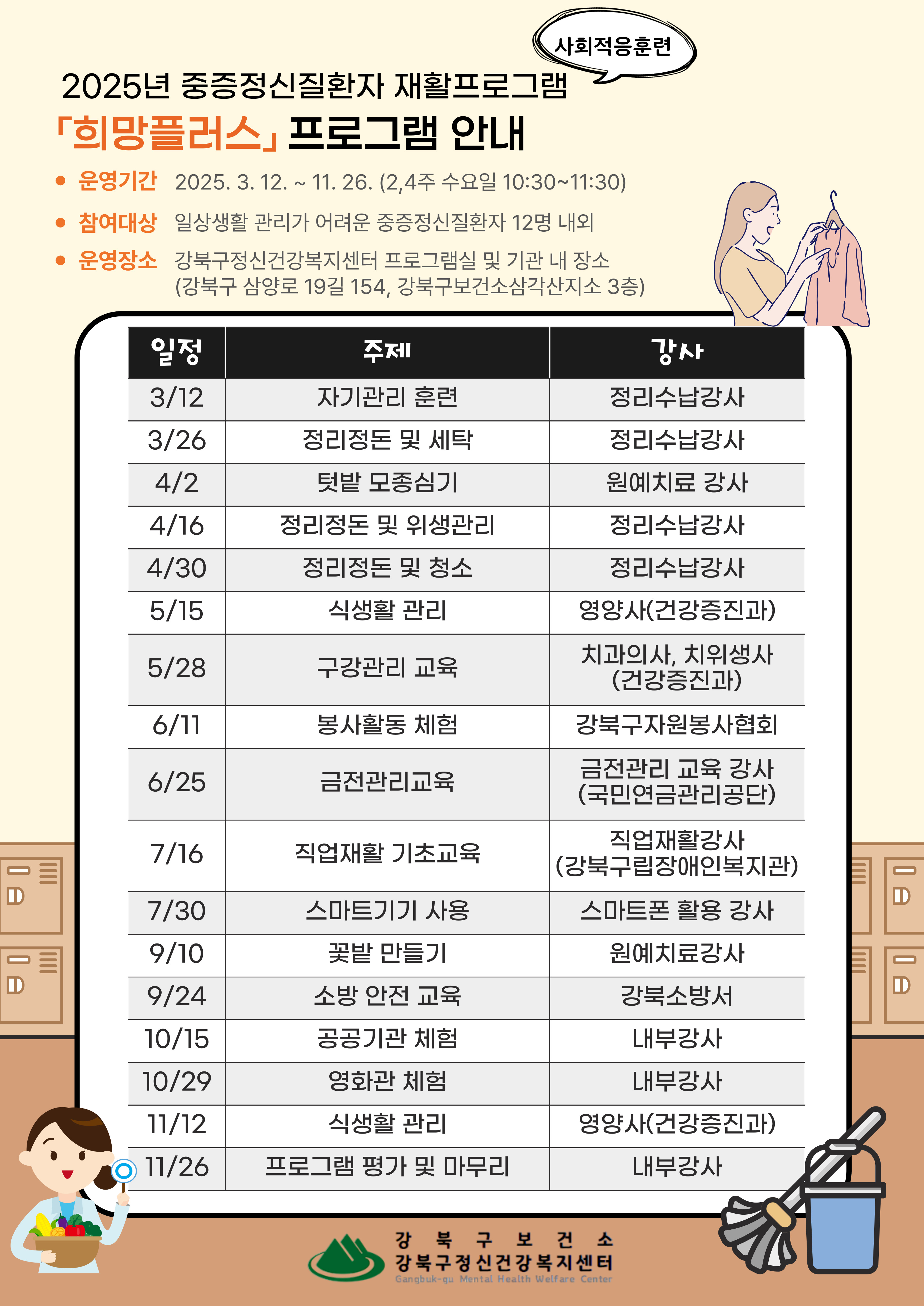 강북구정신건강복지센터에서는 사회 재활 훈련 프로그램 "희망플러스"를 진행합니다.