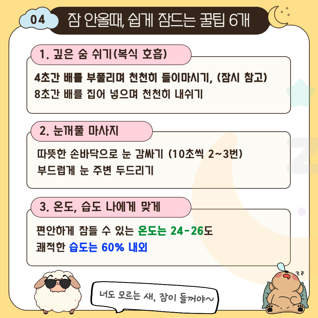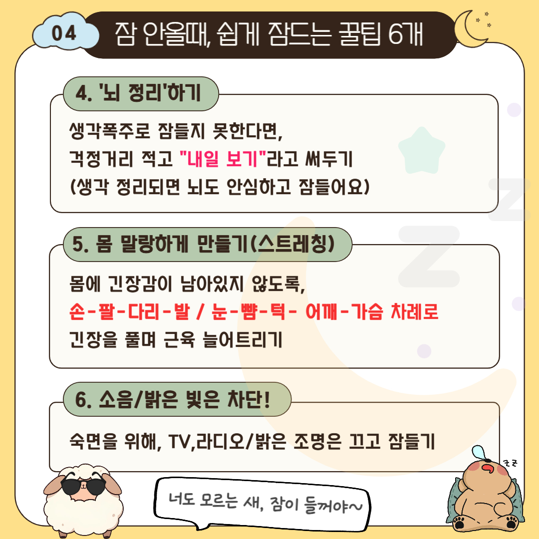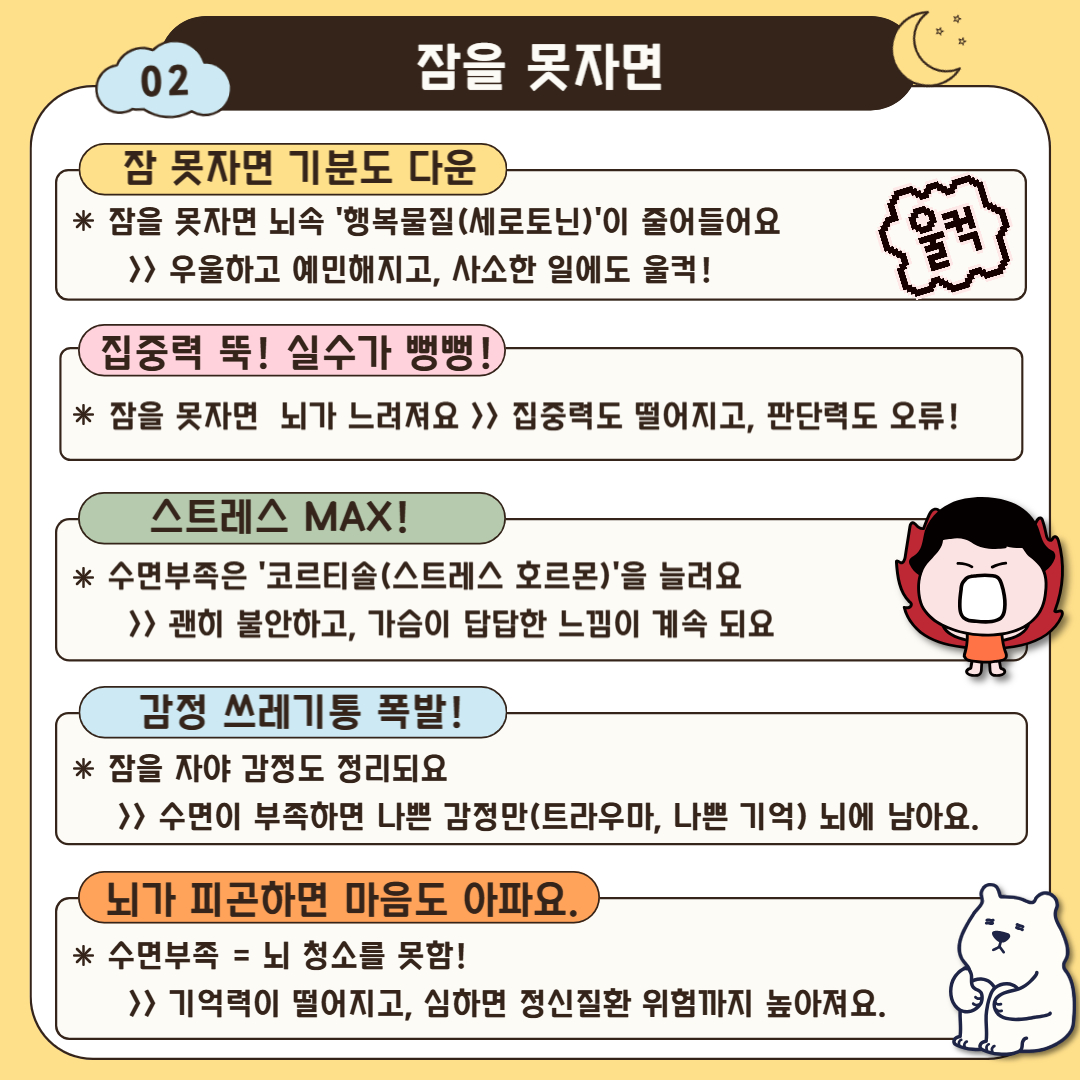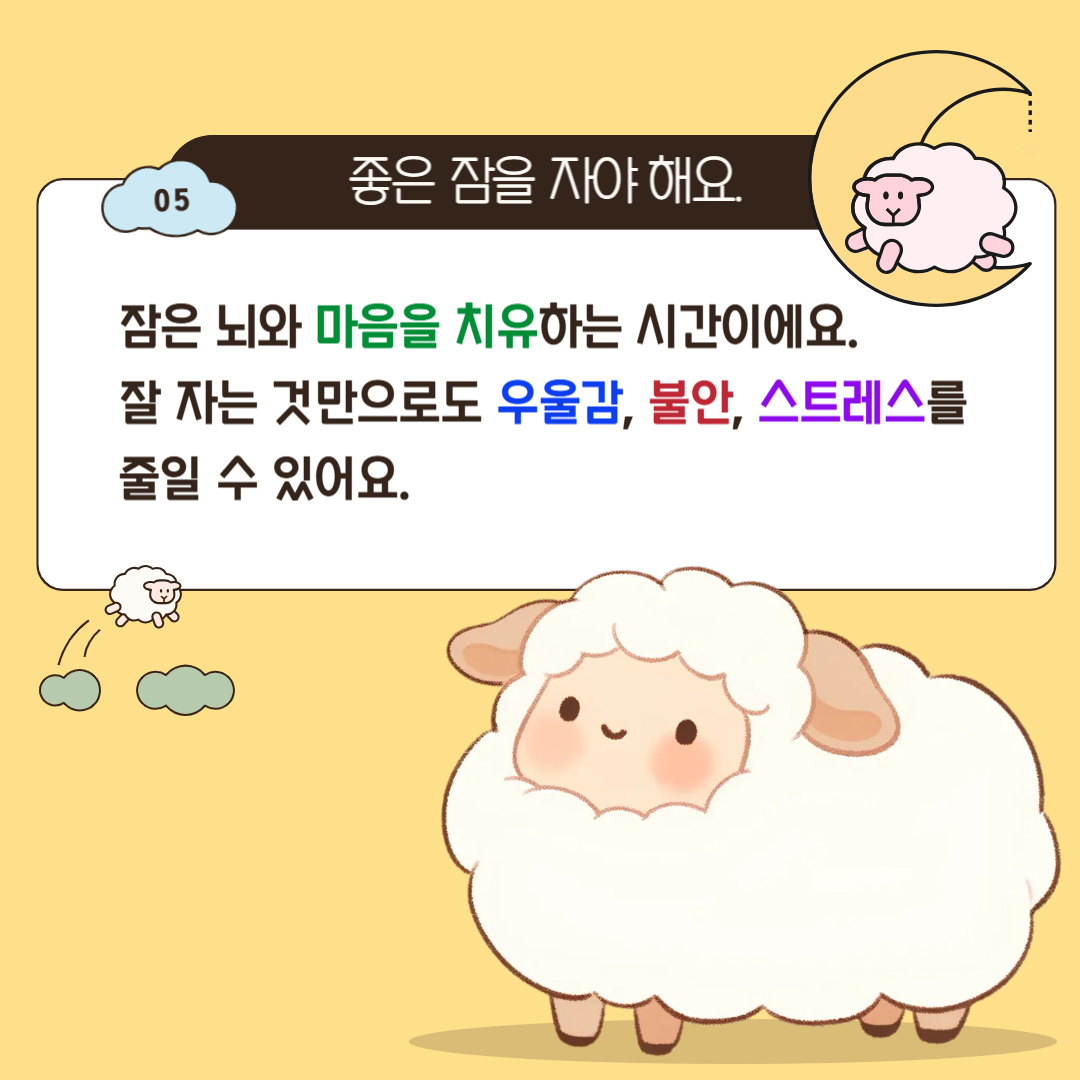 정신건강에 있어서 충분한 수면은 필수요소인 만큼 이번에는 수면과 관련된 카드뉴스를 제작하였습니다.