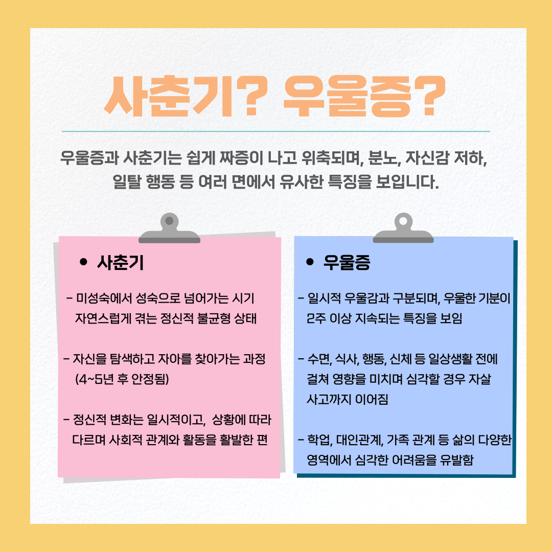 청소년기 우울은 성인과 달리 충동적인 행동이나 신체적 증상으로 표현되는 경우가 많아 자칫 사춘기라 생각하고 방치될수 있어 세심한 주의가 필요합니다.