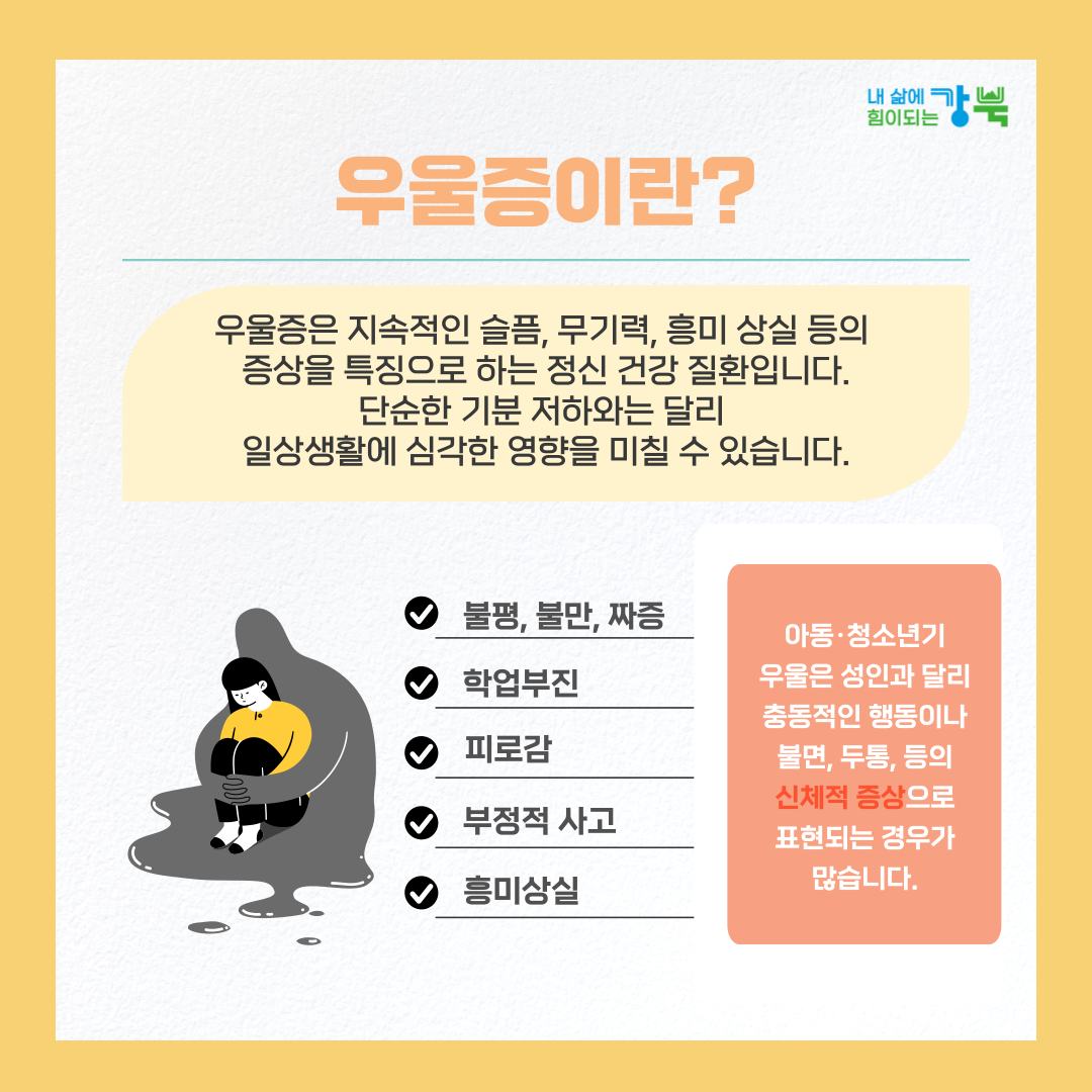 #강북구보건소 #강북구정신건강복지센터 #아동청소년 #마음건강 #정신건강 #치료비지원  #우울증 #강북구정신과 #청소년상담 #청소년우울증 #청소년우울증증상