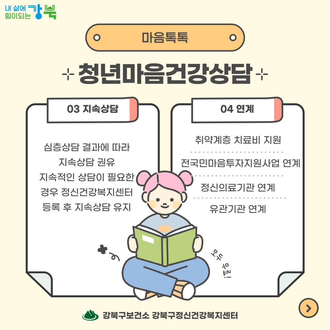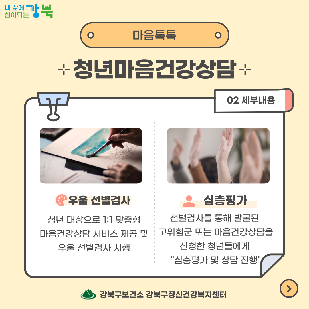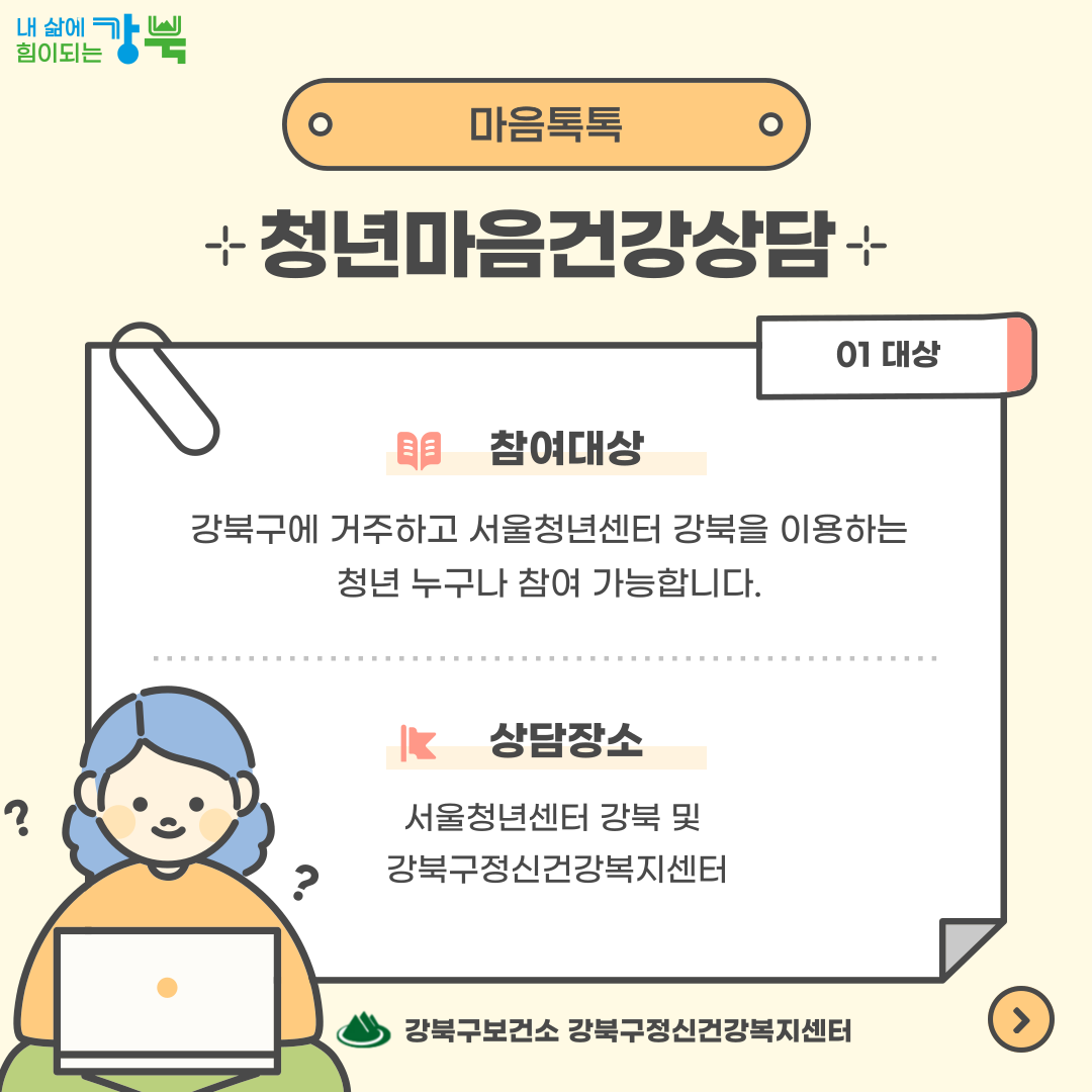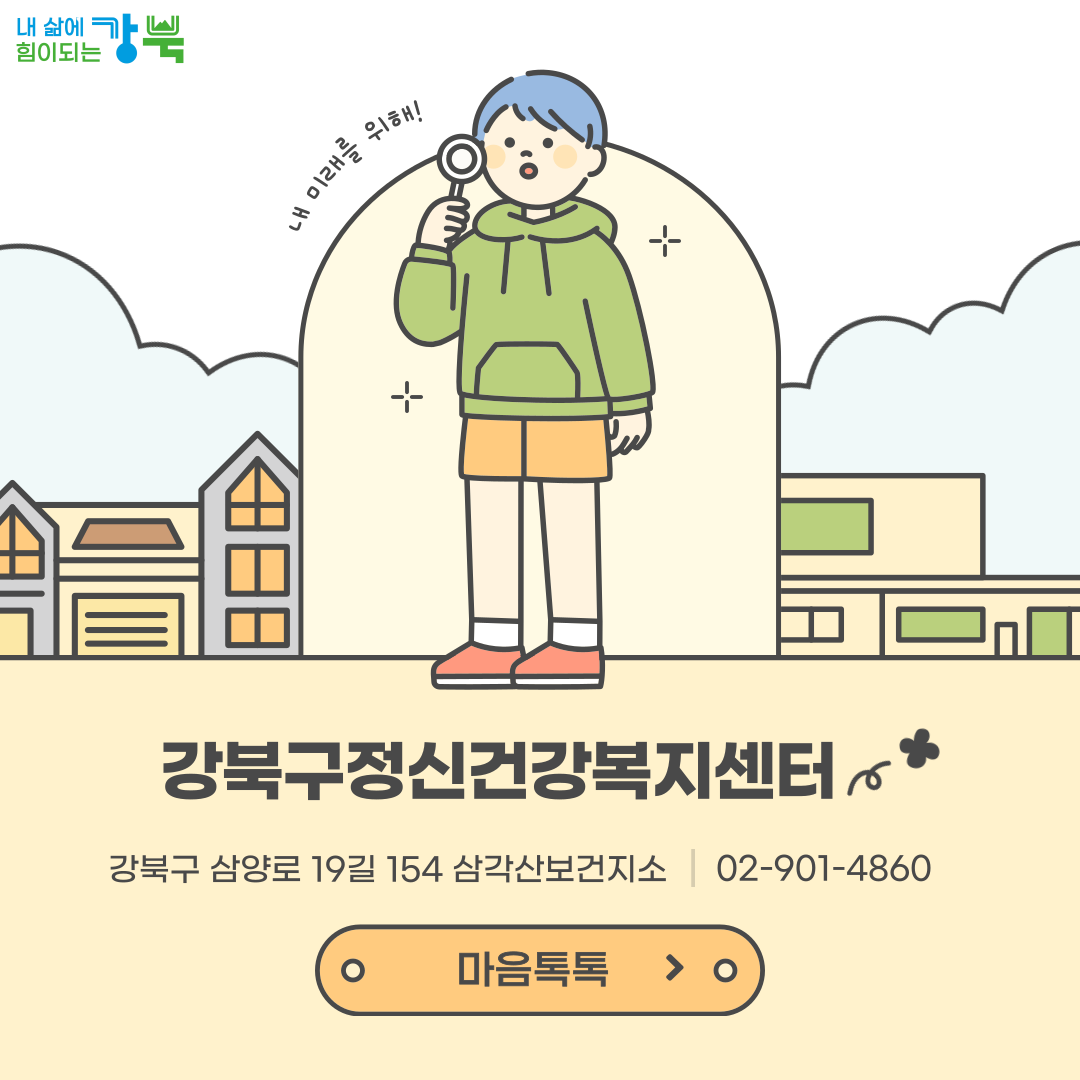 안녕하세요 강북구정신건강복지센터 입니다. 강북구 정신건강복지센터에서는 서울청년센터 강북과 협업하여