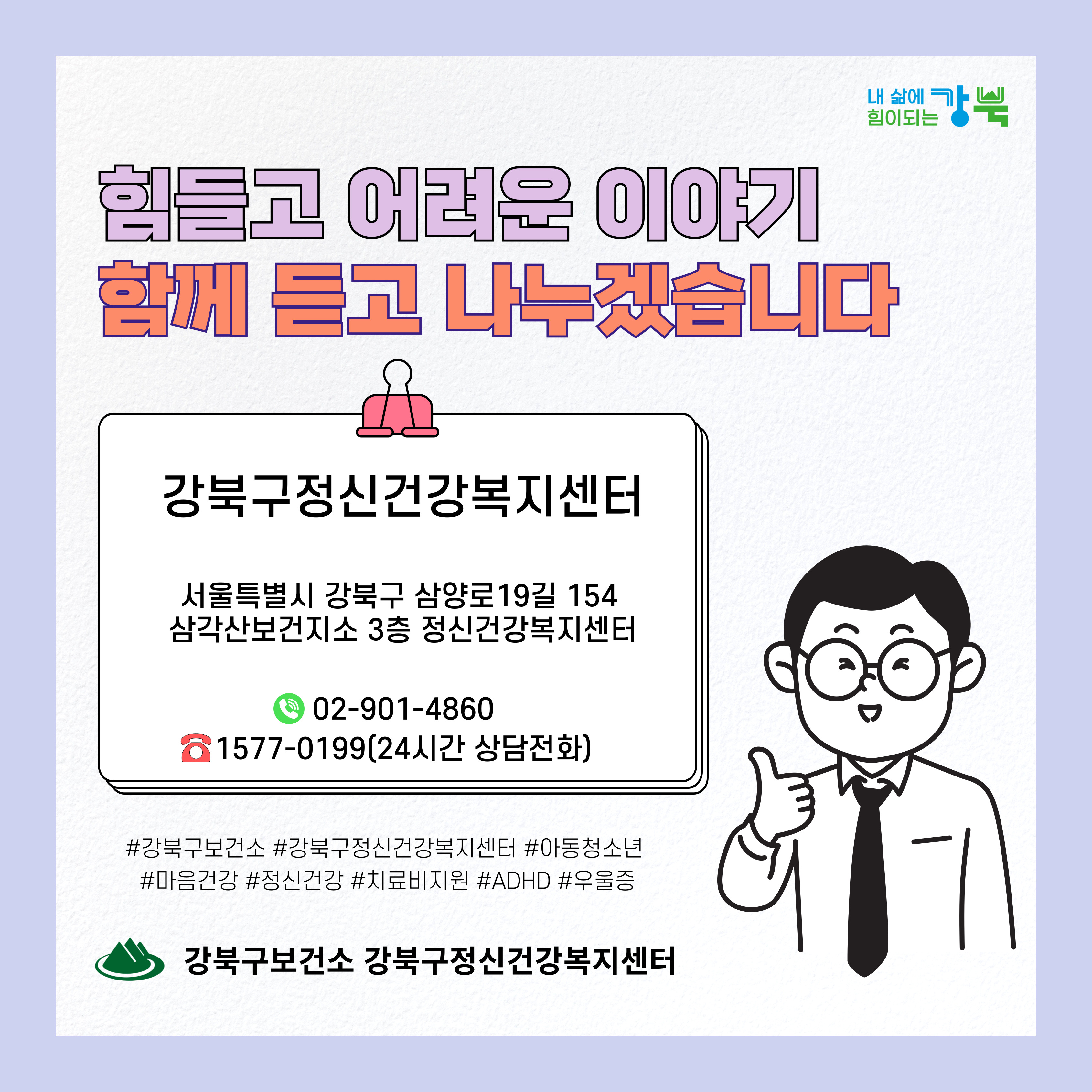 #강북구보건소 #강북구정신건강복지센터 #아동청소년 #ADHD #우울증 #정신건강 #치료비지원