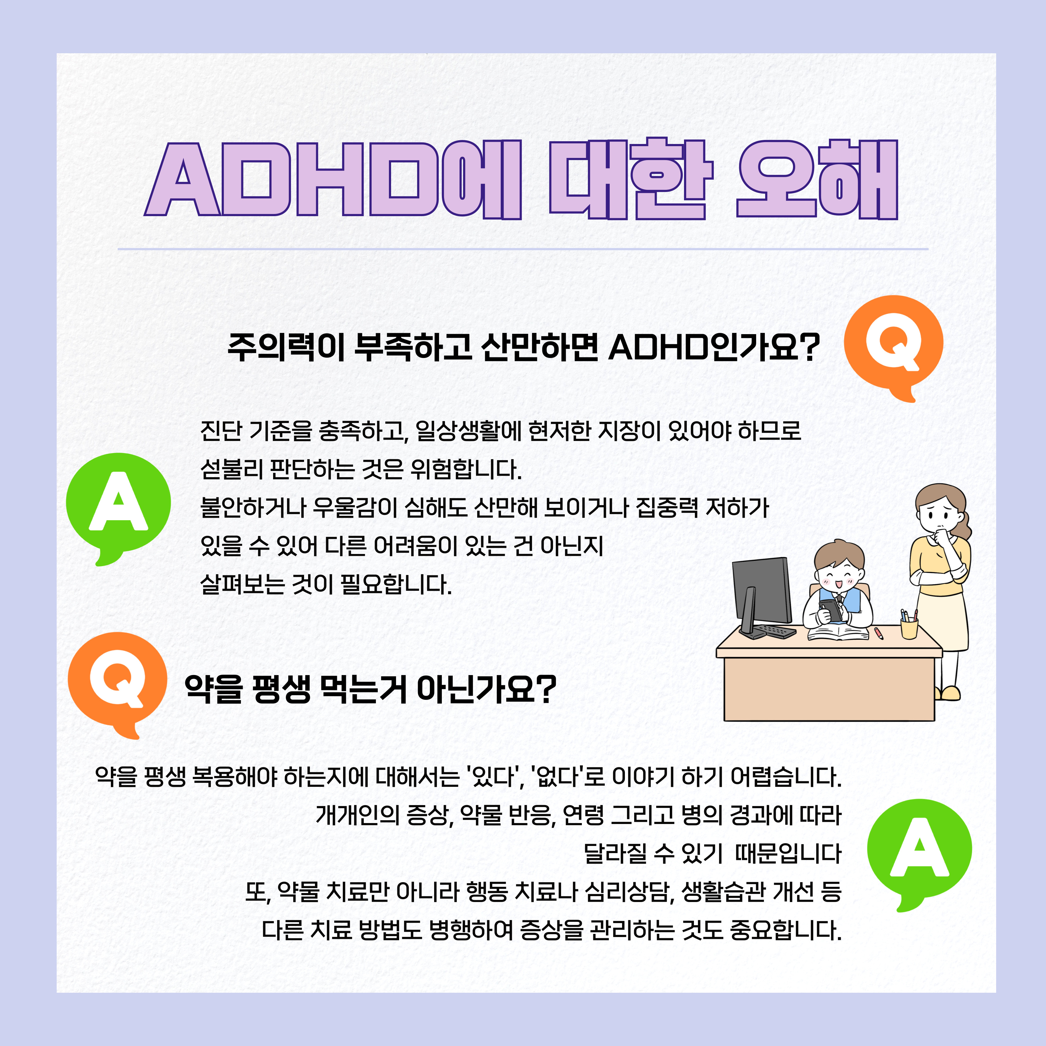 아동기에 가장 흔히 나타나는 정신질환인 ADHD에 대한 카드뉴스를 제작하였습니다.
