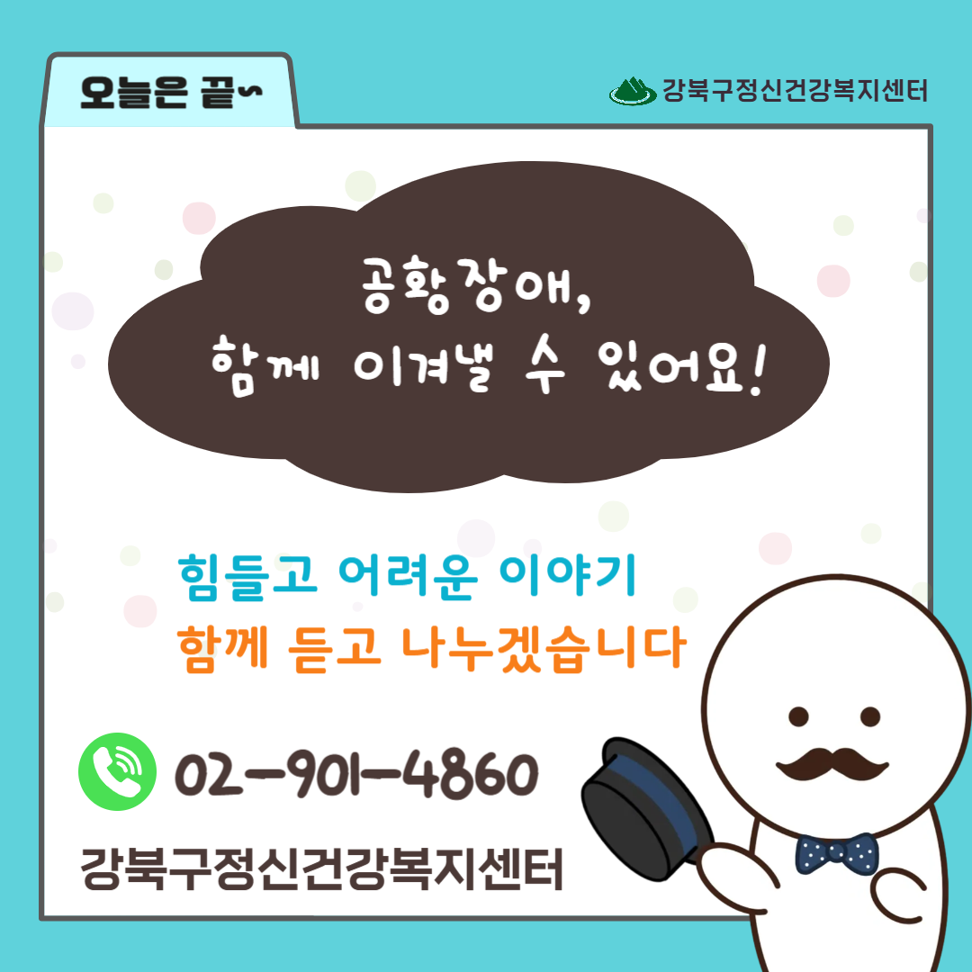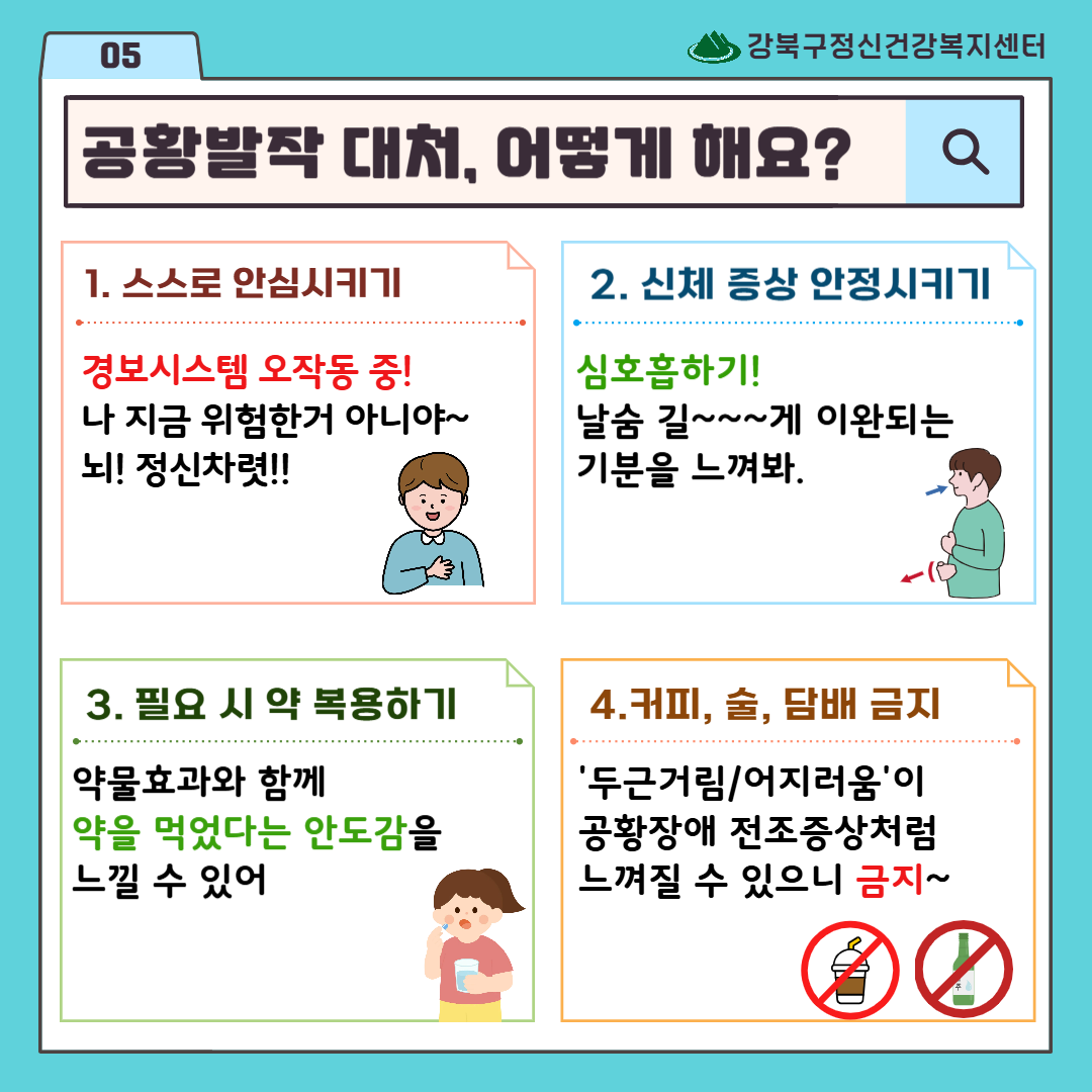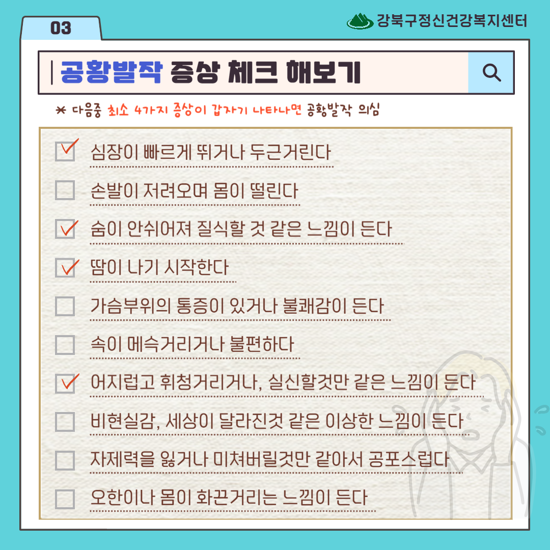 안녕하세요 강북구정신건강복지센터 입니다. 공황장애에 대해 많이 들어보셨을 텐데요 공황장애란 무엇인지, 증상과 대처 방법에 대해 카드뉴스를 제작하였습니다😊 힘들고 어려운 이야기 함께 듣고 나누겠습니다 도움이 필요하시면 연락주세요 #강북구보건소 #강북구정신건강복지센터 #공황장애 #공황발작 #우울증 #정신건강 #마음건강 #상담