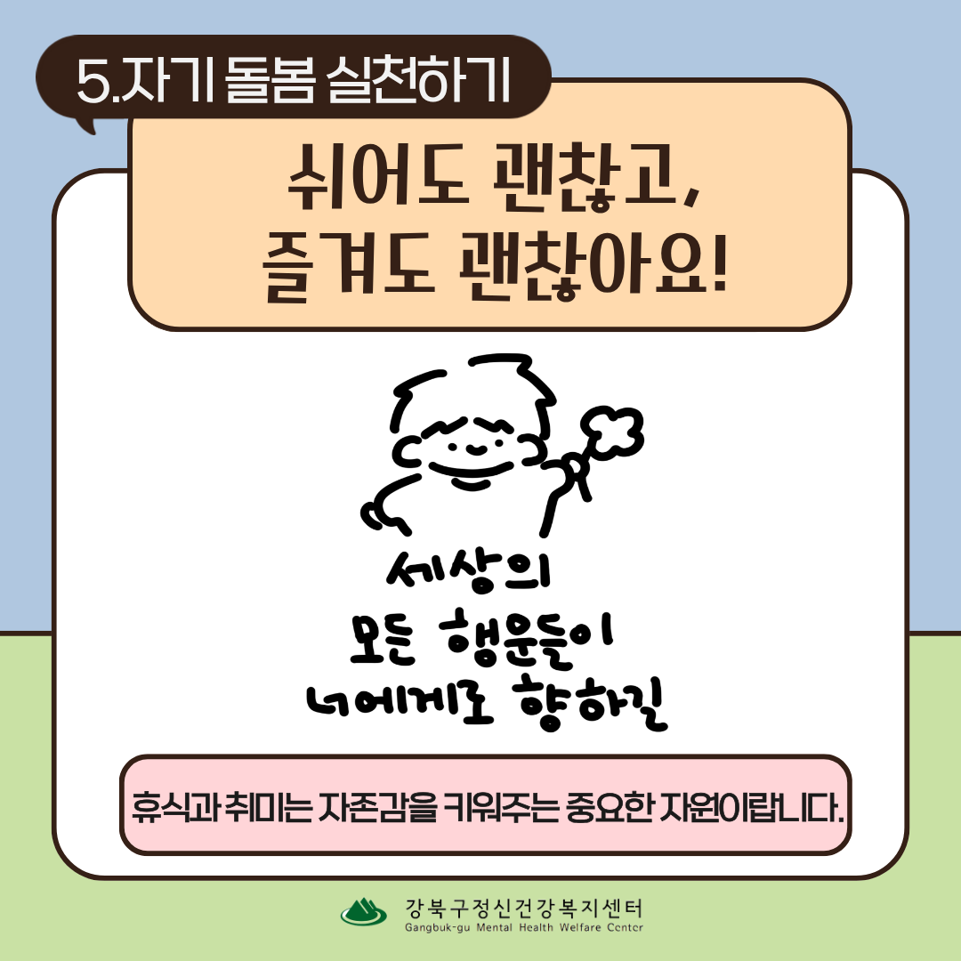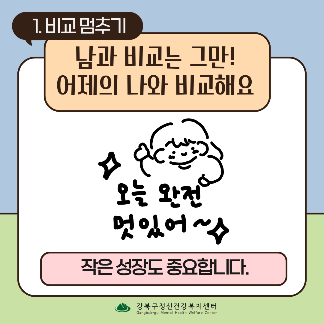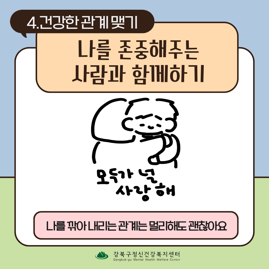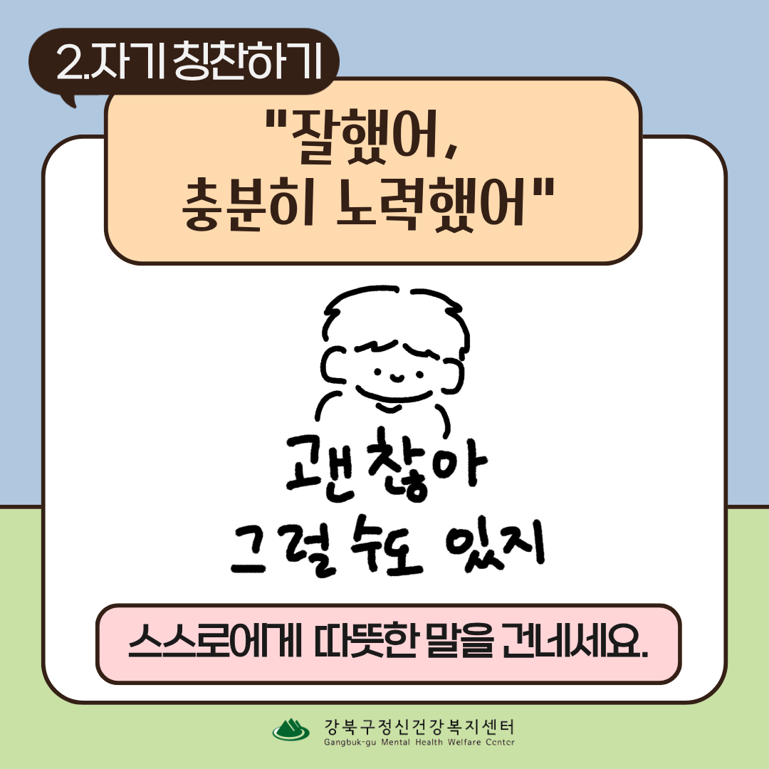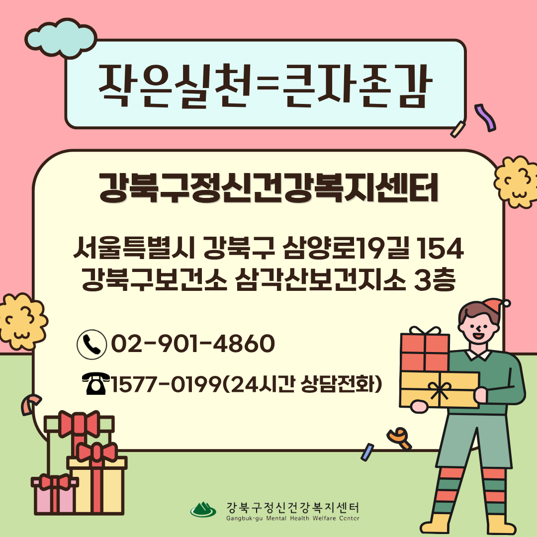 안녕하세요. 강북구정신건강복지센터 입니다.😊 자존감이란, 스스로를 높게 평가하는지, 또는 낮게 평가하는 지에 대한 수준을 의미해요. 나는 나를 어떻게 평가하는지 생각해본적이 있으신가요? 자존감을 지키는 6가지 방법에 대하여 카드뉴스를 통해 알아보겠습니다. 작은실천은 큰 자존감으로 이어질수 있어요. 당신을 응원합니다! #강북구정신건강복지센터 #강북구보건소 #마음건강 #정신건강 #자존감 #긍정 #긍정의힘 #나를사랑하는연습